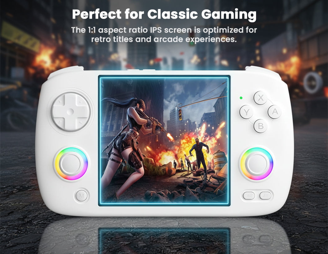 Experience retro gaming like never before with the all-new Anbernic RG CubeXX Handheld Gaming Console. Featuring a crisp 3.95-inch IPS fully laminated touchscreen (720x720 & 1:1 ratio), a powerful H700 quad-core processor, and dual 16-million-color RGB joystick rings. Every game comes alive with this console’s vibrant visuals and customization. This sleek device supports WiFi, Bluetooth, and even HDMI output, which enables online multiplayer and streaming as well as TV connection. Its Linux 64-bit system and 64GB storage (also expandable) give you access to over 30 emulators, including PSP, N64, PS1, and many more. You can also effortlessly load your personal game library on this console through memory expansion. Intuitive controls, vibration feedback, and high-fidelity speakers make every session immersive. With a lightweight and ergonomic design, this console is available in both black & white colors.