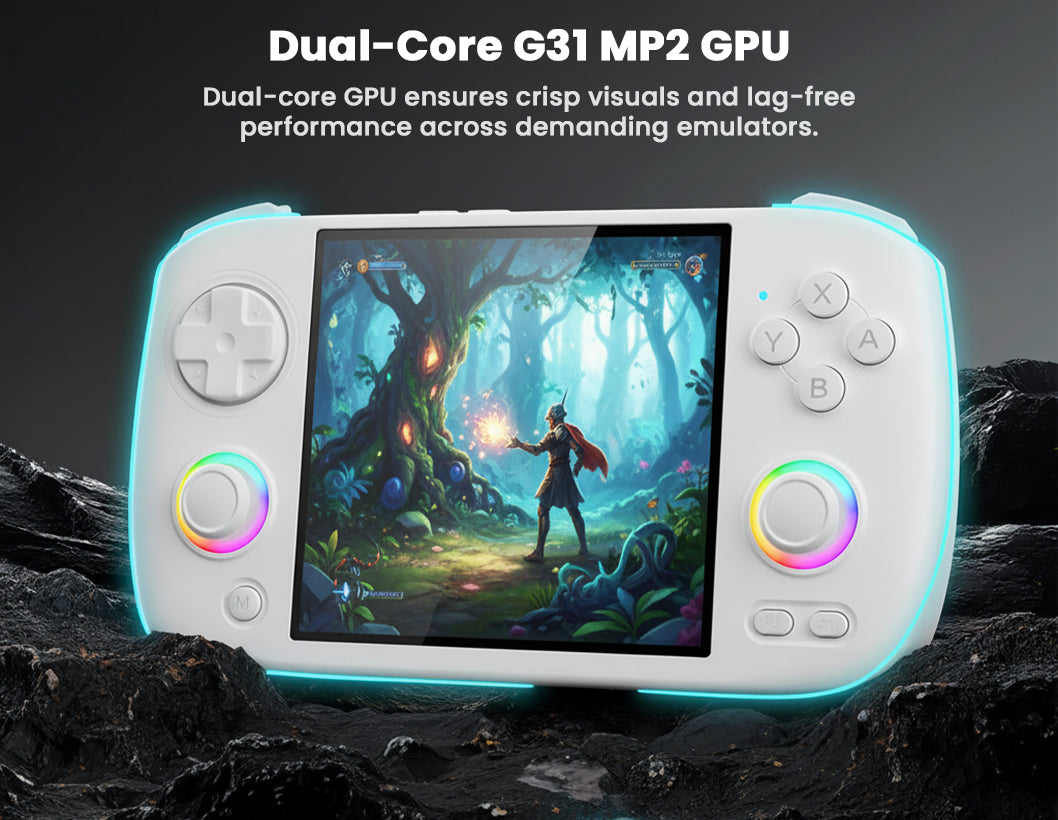 Powered by the H700 quad-core ARM Cortex-A53 processor running at 1.5GHz complemented by a dual-core G31 MP2 GPU and 1GB LPDDR4 RAM. The RG CubeXX ensures smooth, lag-free gameplay across a wide range of emulators. This setup supports over 30 retro gaming systems, including PSP, N64 and PS1, delivering crisp visual and audio performance for an authentic and enjoyable gaming experience.