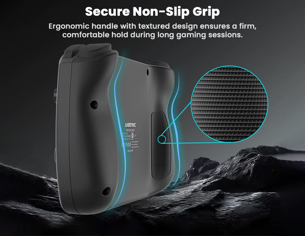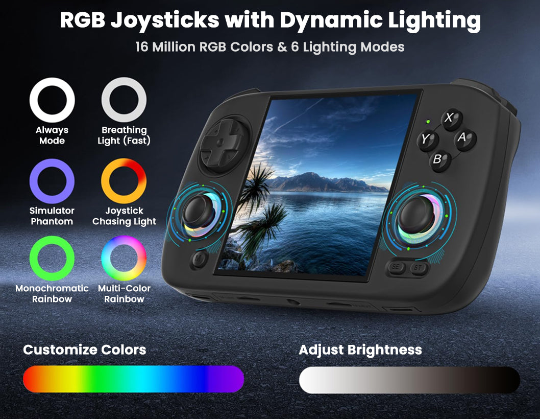 The device includes dual joystick rings with dazzling RGB lighting capable of displaying 16 million colors. Players can personalize their gaming experience with six adjustable lighting modes, including steady, breathing, color flow and rainbow effects. The brightness and color can be fine-tuned to create a unique and stylish gaming atmosphere, enhancing device aesthetics and user engagement.