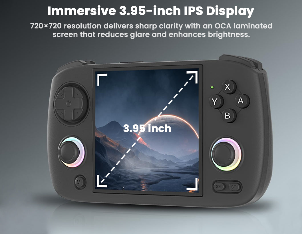 The Anbernic RG CubeXX features a 3.95-inch IPS screen with OCA full lamination, delivering a sharp 720x720 resolution. This square 1:1 aspect ratio screen offers vibrant colors and wide viewing angles which are perfect for retro games and vertical arcade titles. The full lamination reduces glare and improves touch responsiveness, providing a crisp and immersive gaming visual experience that enhances every pixel of your favorite classic games.