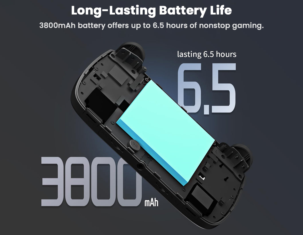 Powered by a 3800mAh rechargeable lithium-polymer battery, the device offers up to 6.5 hours of uninterrupted gaming. Its lightweight and ergonomic design ensures comfort during long gaming sessions, making it perfect for both home and portable use. Charging is convenient via a Type-C port supporting fast and reversible plugging.