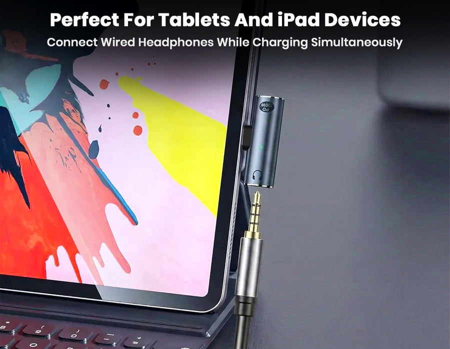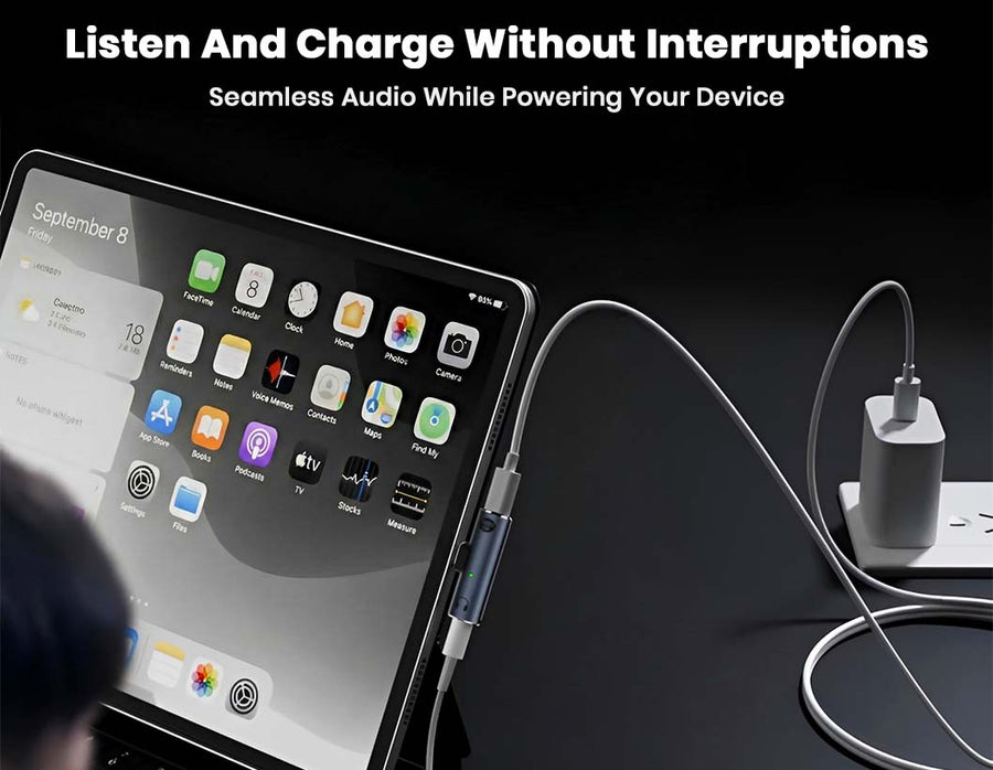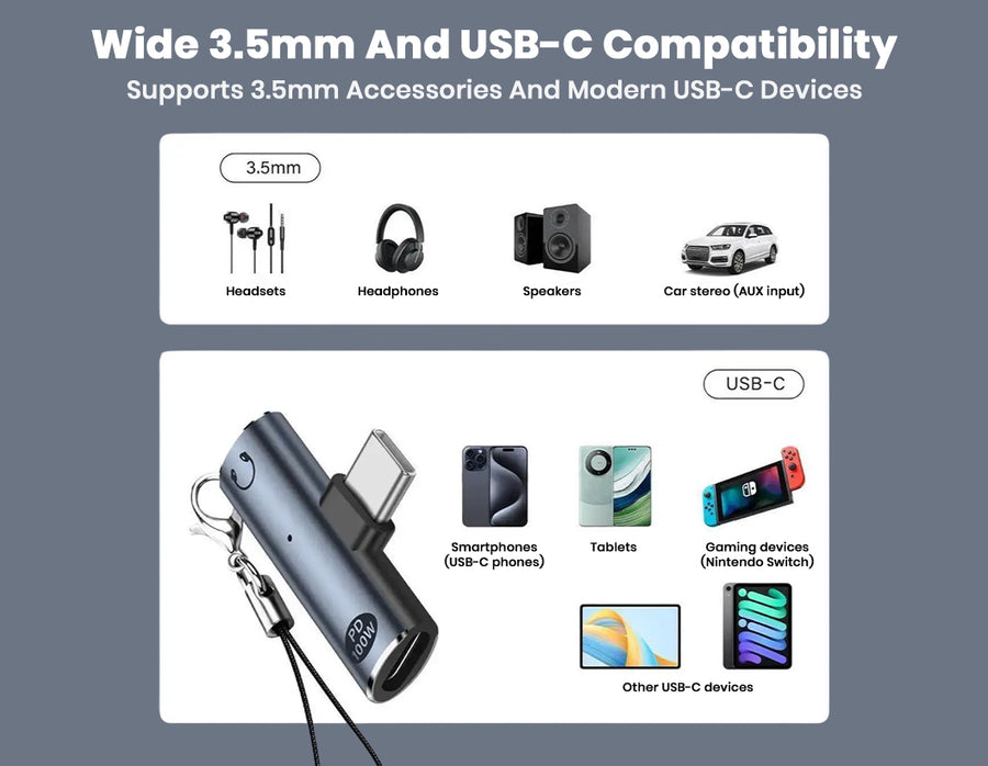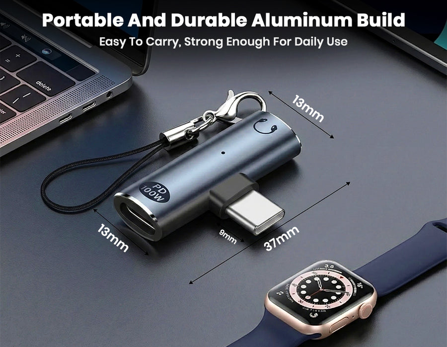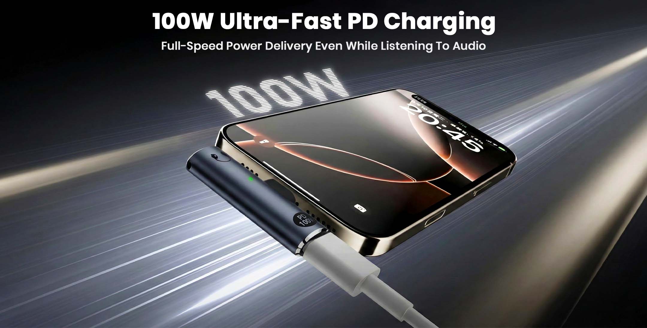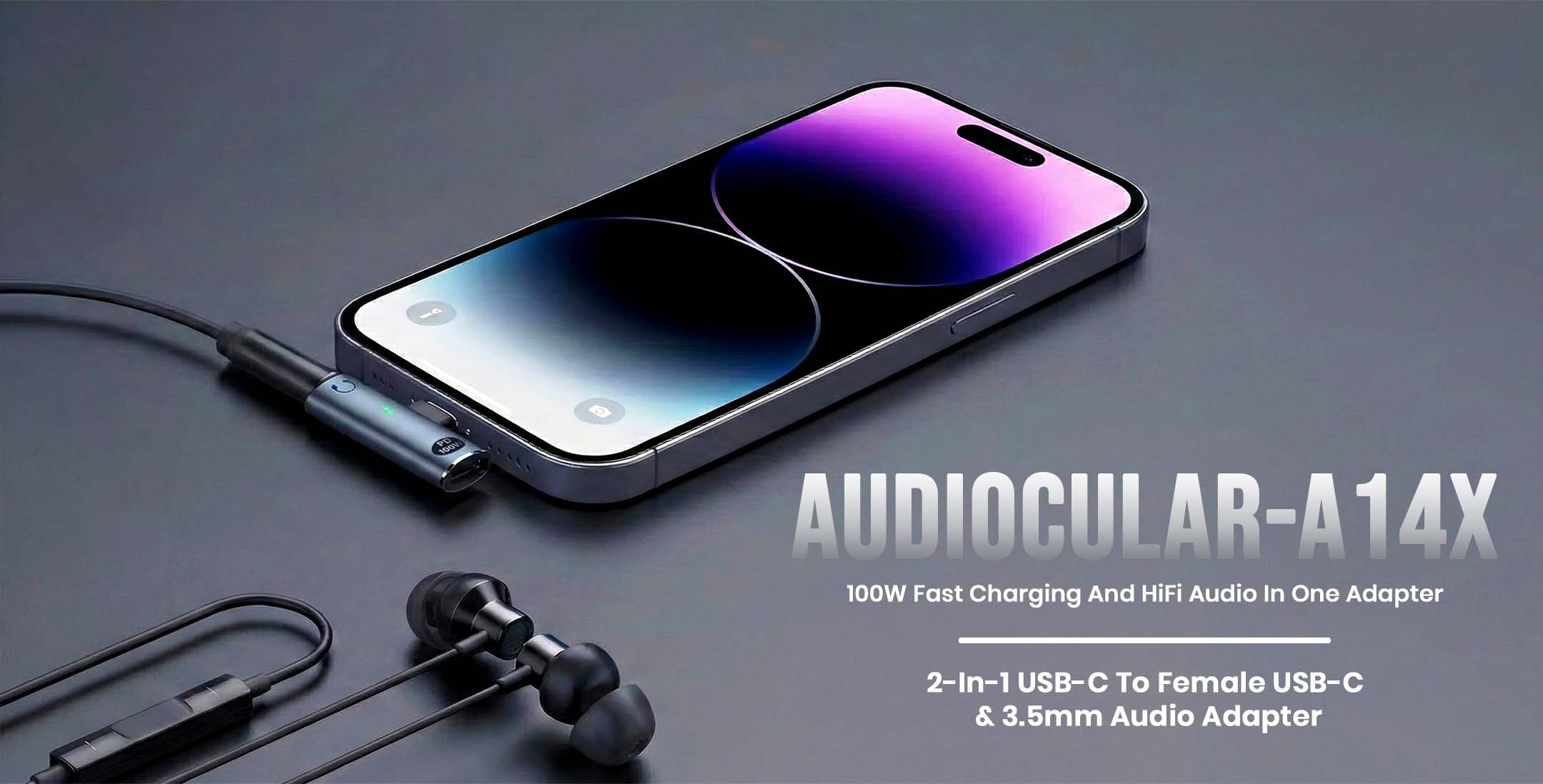 AUDIOCULAR A14X USB-C to 3.5mm Adapter with Charging lets you connect 3.5mm headphones to USB-C devices while charging simultaneously without interruptions. It supports 100W PD fast charging (20V/5A) to maintain your device's full speed. Enjoy full audio functions including music, calls, and wired line controls (mic/volume) via TRRS compatibility. Built-in DAC delivers lossless 16-bit/44.1kHz HiFi sound with distortion-free transmission. The ultra-thin & compact aluminum design is durable, and supports plug-and-play functionality with no need for extra drivers. Compatible with devices like iPhone 16/15 series, Galxy S23/S22/S21/Note/Z Flip5/Fold5, Pixl 7/6/5/4, iPad Air/Pro and many other USB-C devices.