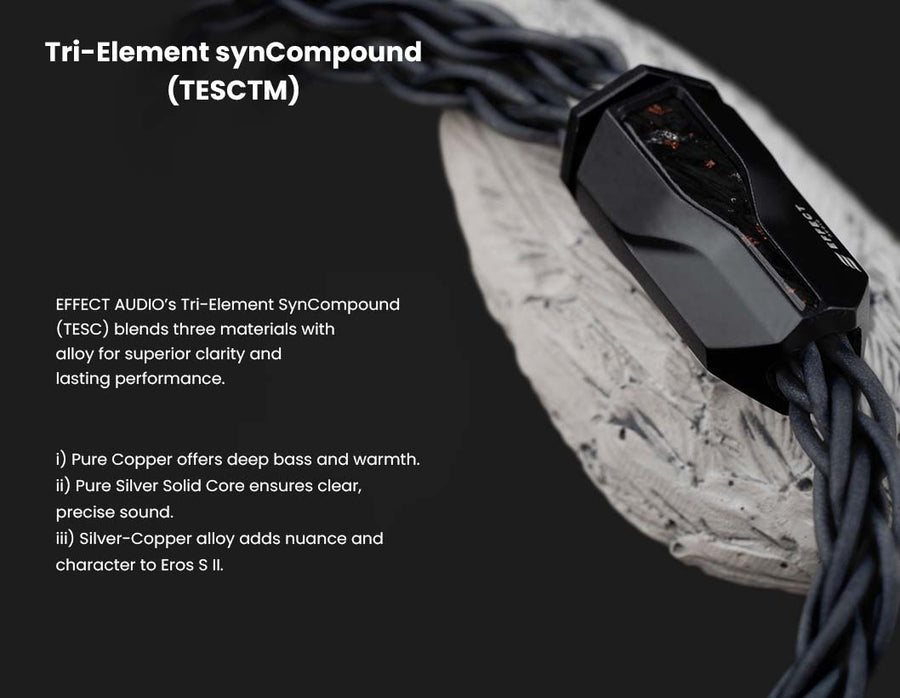 Effect Audio Eros S II Upgrade Cable for IEMs features the advanced Tri-Element SynCompound (TESC™), combining pure copper, pure silver solid core, and a silver-copper alloy in its design. Pure copper provides deep, resonant bass and rich tonality, while the pure silver solid core ensures exceptional clarity and precision. The precisely balanced silver-copper alloy, refined through extensive testing, adds nuanced details and a distinctive character. Designed for audiophiles, this cable is a premium upgrade, enhancing the performance of in-ear monitors (IEMs) with superior sound quality and refined craftsmanship.