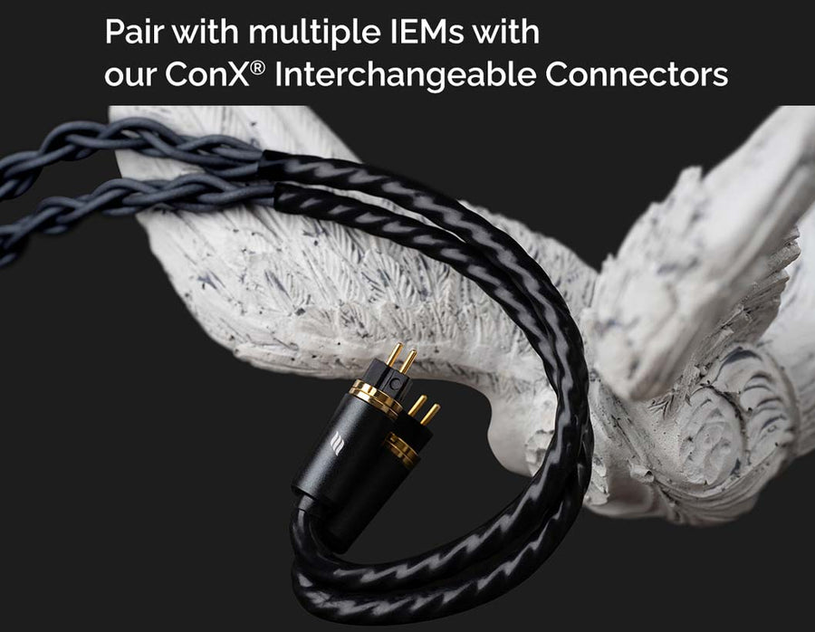 entaconn Ear, IPX, A2DC) by purchasing optional ConX adapters, expanding the cable's compatibility with a wide range of IEMs. The source side terminates in a standard Rhodium-plated brass 4.4mm straight plug.