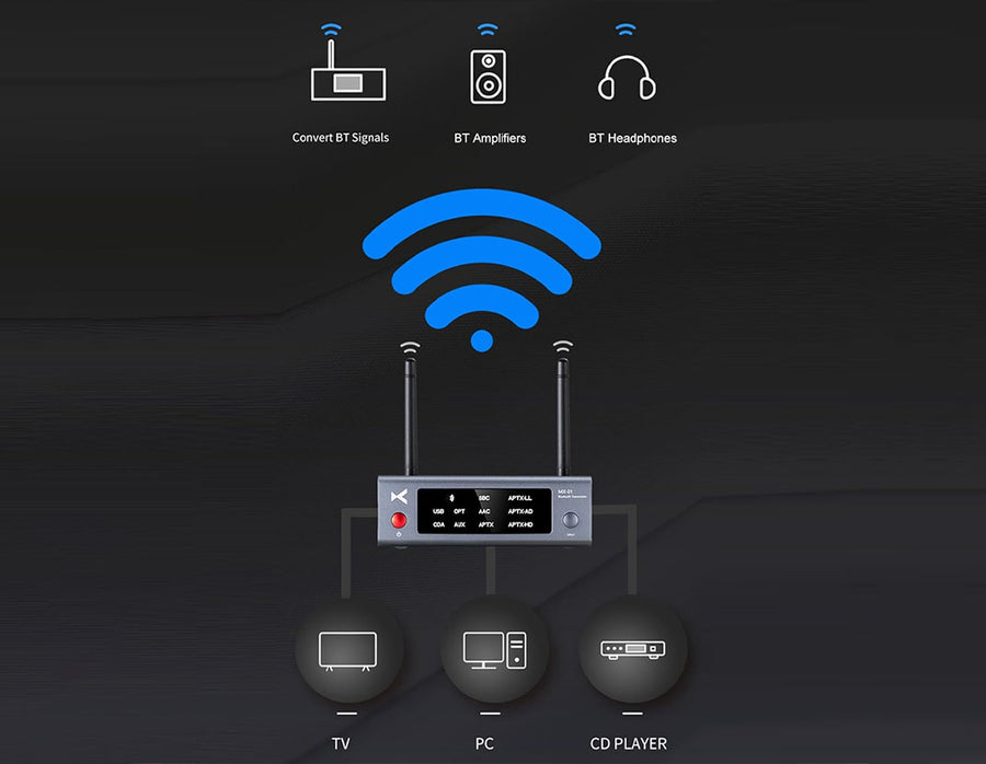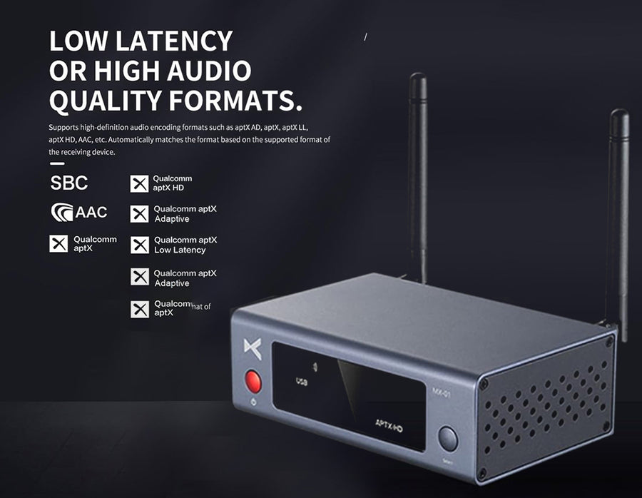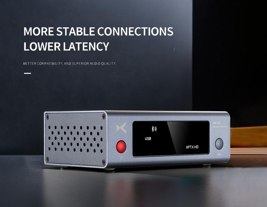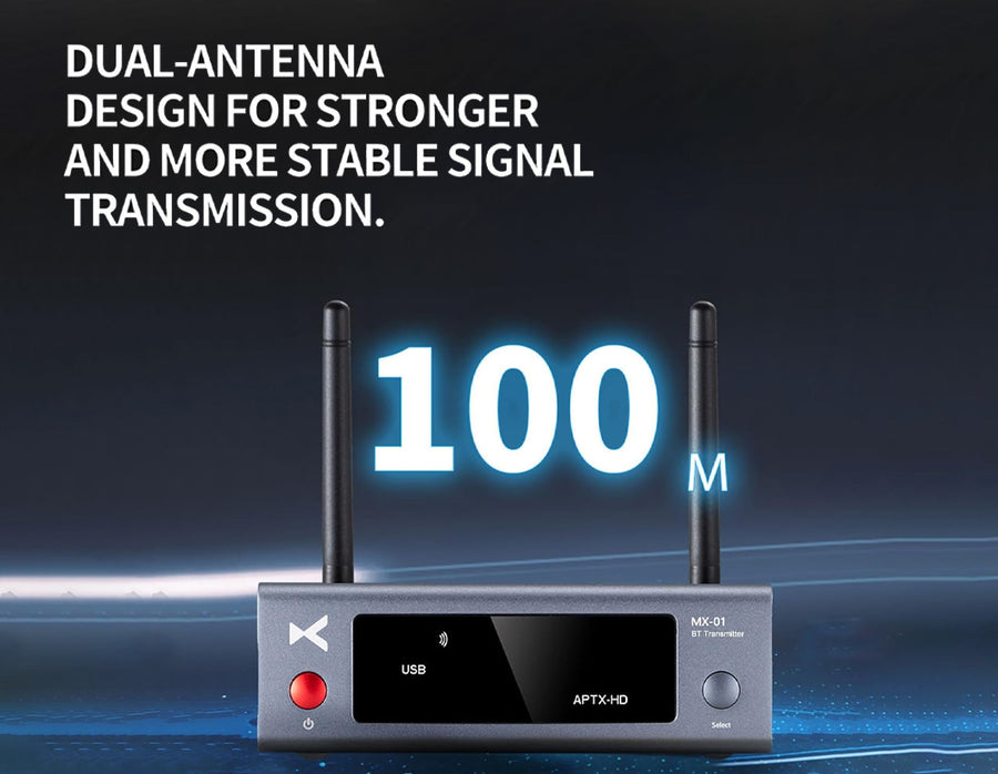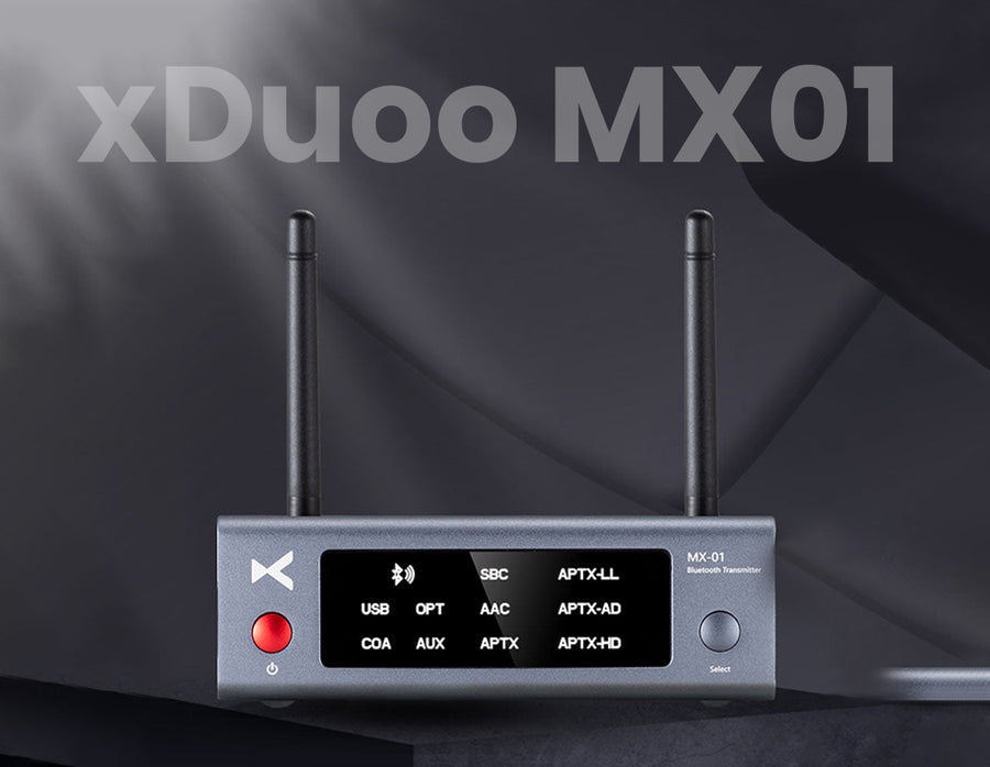 The xDuoo MX-01 is a high-performance Bluetooth transmitter designed to bring modern wireless streaming to your classic audio devices. Whether it's a TV, CD player, computer, or stereo system, the MX-01 transforms it into a Bluetooth transmitter, allowing seamless connection to wireless headphones or speakers. Powered by a Qualcomm chipset, it offers ultra-stable transmission, low latency, and support for high-definition audio codecs including aptX HD, aptX LL, aptX Adaptive, AAC, and SBC. Its versatile input options—USB-C, Optical, Coaxial, and AUX—ensure wide compatibility with both analog and digital sources, while dual antennas provide an impressive 100-meter range. Housed in a sleek aluminum alloy casing, this Bluetooth transmitter not only looks premium but also minimizes interference for clean, uninterrupted sound.