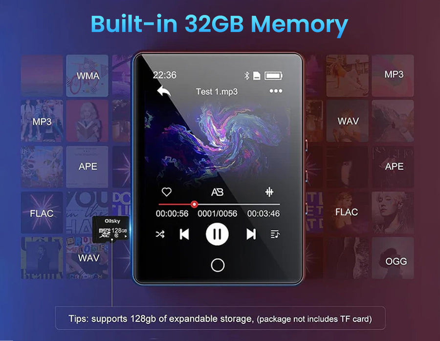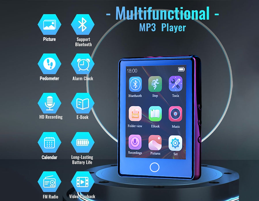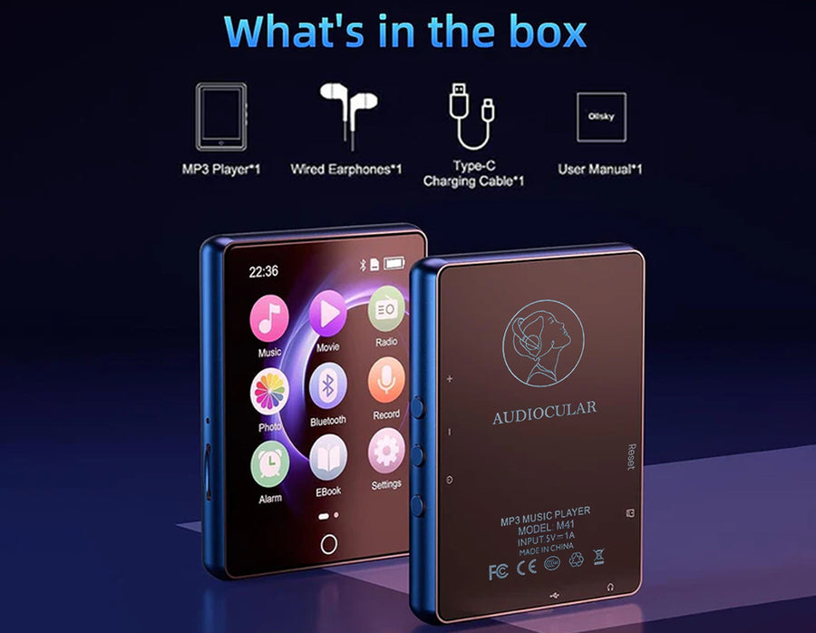 AUDIOCULAR M41 is a versatile Portable Mp3 Player designed for convenience and functionality. It features Bluetooth 5.0 for wireless connectivity, a 2.8" LCD touch screen with 32GB internal storage expandable to 128GB, and supports multiple audio formats for high-definition playback. Additionally, it includes a built-in speaker, voice recording capabilities, a pedometer, a video player, alarm, FM radio, and more. With its user-friendly interface and premium wired earphones included, it's ideal for various activities like sports, leisure, and professional use, offering a comprehensive audio and multimedia experience in a compact device.