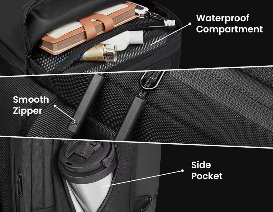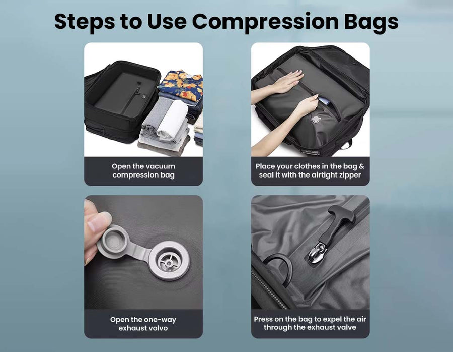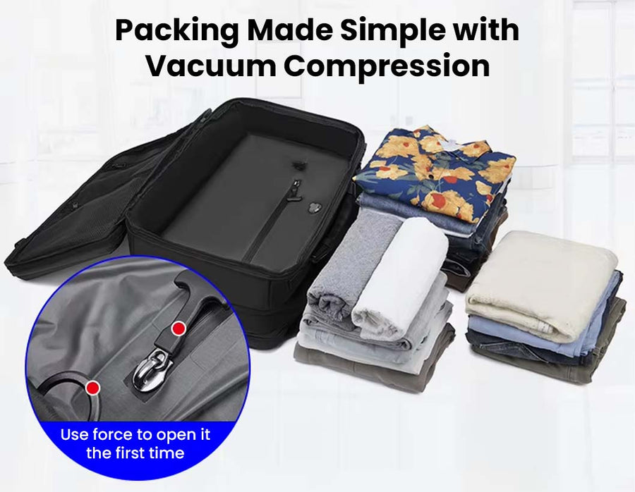 This expandable vacuum backpack adjusts from 30L to 60L, offering a versatile 3-in-1 design those functions as a luggage bag, shoulder bag, and laptop bag. It includes a vacuum bag with a one-way valve for efficient packing—use an electric vacuum pump (Optional) for quick compression or press manually to remove air, saving space in your luggage. This vacuum backpack perfect for travel, work, or outdoor activities, it features a separate shoe compartment, multiple pockets for organization, and an anti-theft pocket for security, USB A charging port and luggage sleeve. The backpack bag made from waterproof Oxford fabric with rust-free metal zippers and a breathable, anti-sweat back panel, this backpack is both comfortable and durable for any adventure!