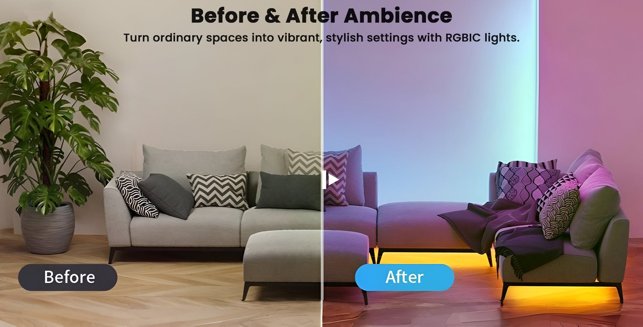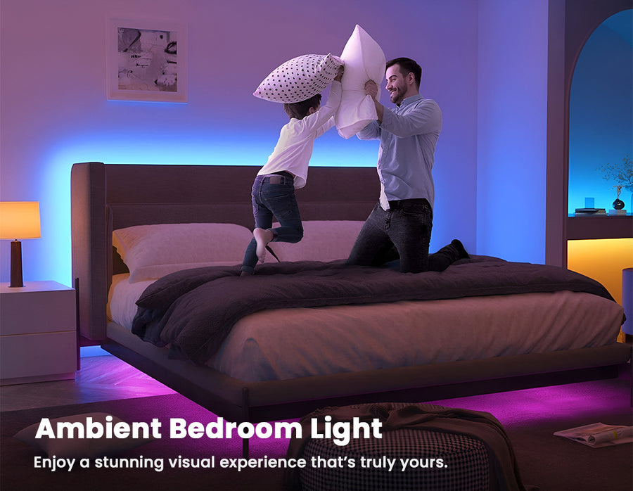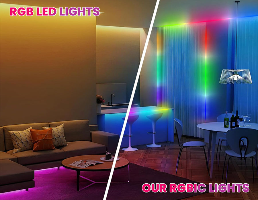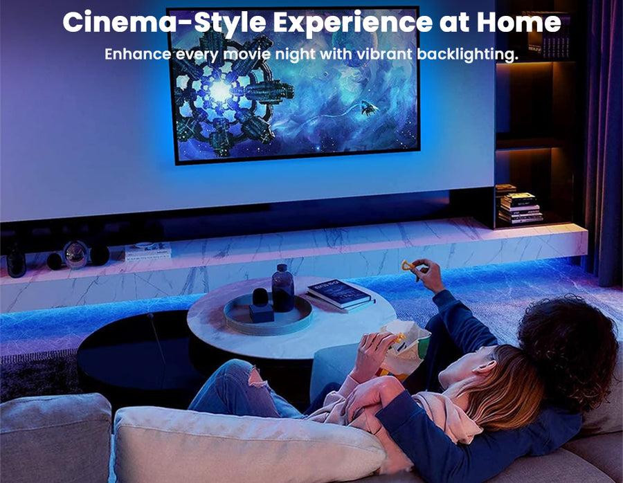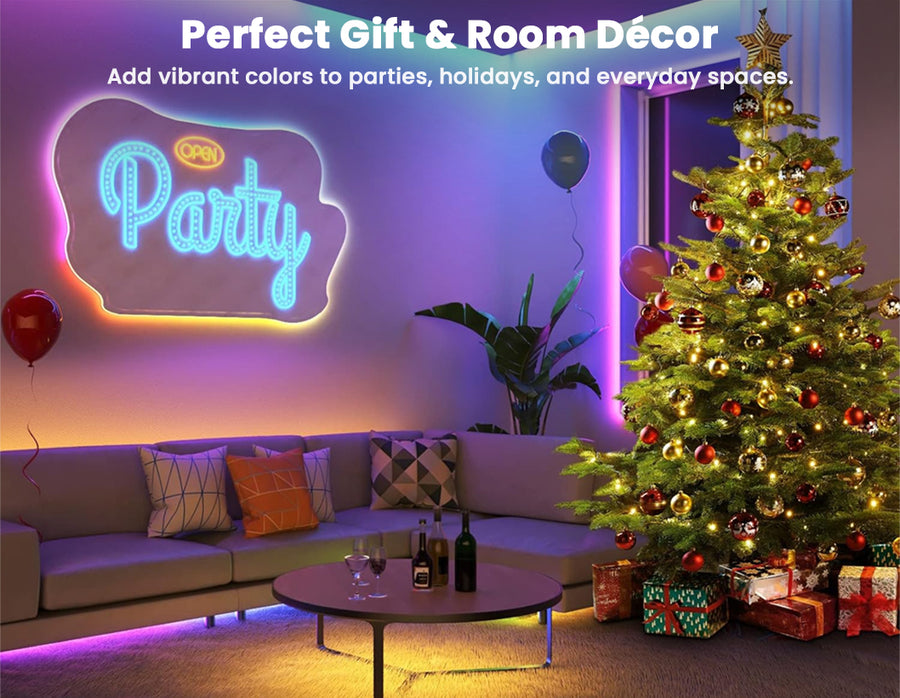 This RGBIC adhesive LED strip light kit combines a 5V USB strip, in‑line music controller box, 24 key RF remote and DuoCo StripX app for complete smart lighting control. Addressable LEDs deliver dreamcolor flowing effects with custom styles gradients, chasing and music‑reactive patterns that standard RGB strips cannot reproduce, transforming TVs, gaming desks and bedrooms into immersive ambient lighting zones. With Bluetooth app control, timers, DIY scenes and easy USB power, the kit is designed as a plug‑and‑play upgrade for modern décor, streaming backgrounds and party lighting.