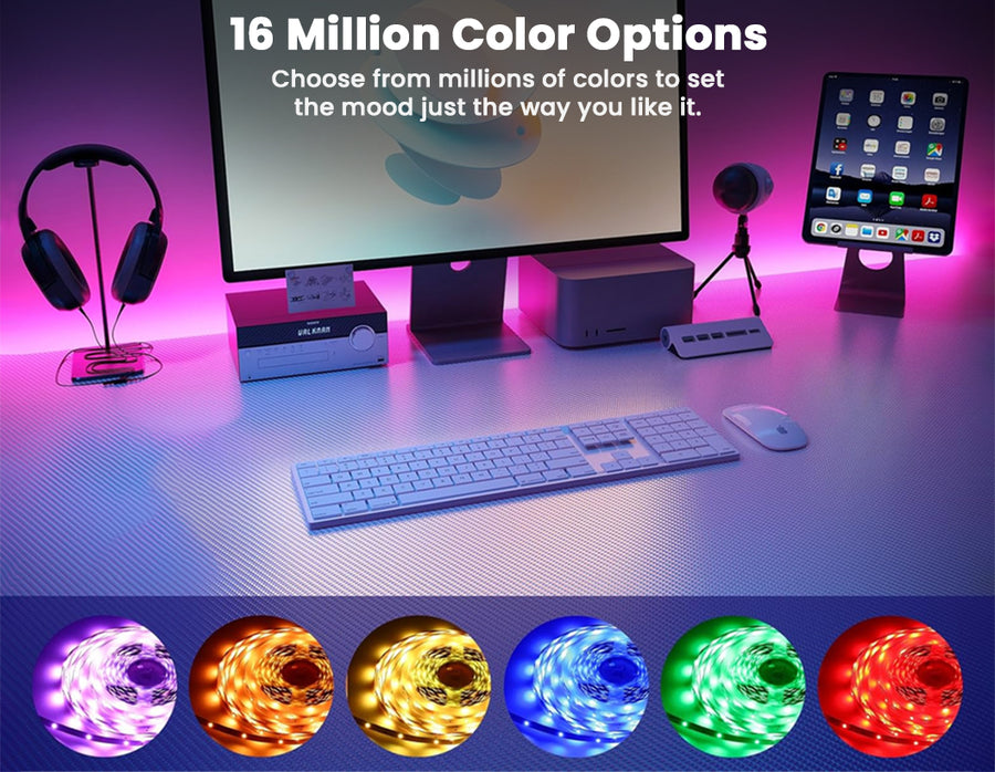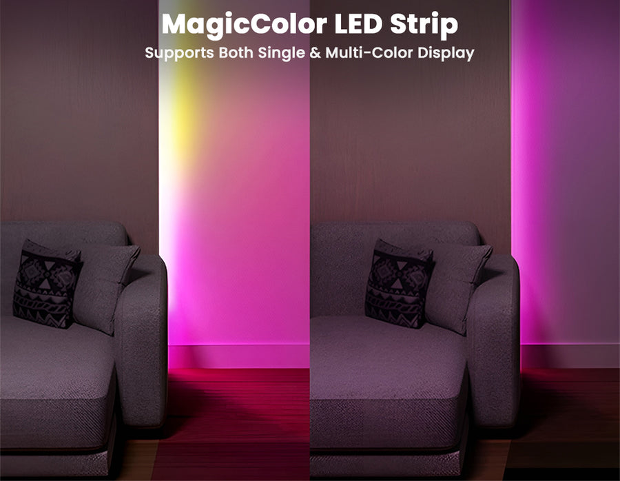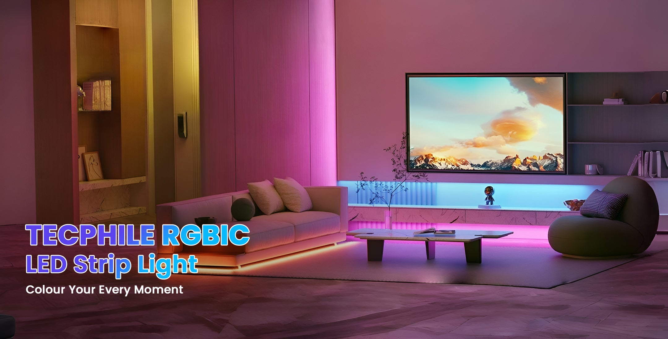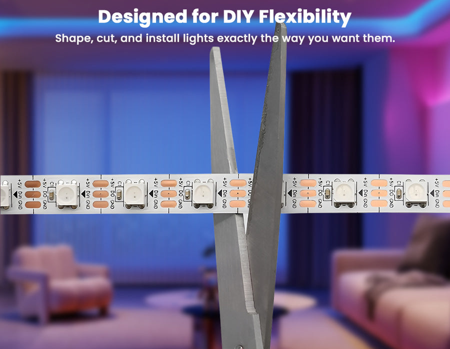 This RGBIC adhesive LED strip light kit combines a 5V USB strip, in‑line music controller box, 24 key RF remote and DuoCo StripX app for complete smart lighting control. Addressable LEDs deliver dreamcolor flowing effects with custom styles gradients, chasing and music‑reactive patterns that standard RGB strips cannot reproduce, transforming TVs, gaming desks and bedrooms into immersive ambient lighting zones. With Bluetooth app control, timers, DIY scenes and easy USB power, the kit is designed as a plug‑and‑play upgrade for modern décor, streaming backgrounds and party lighting.