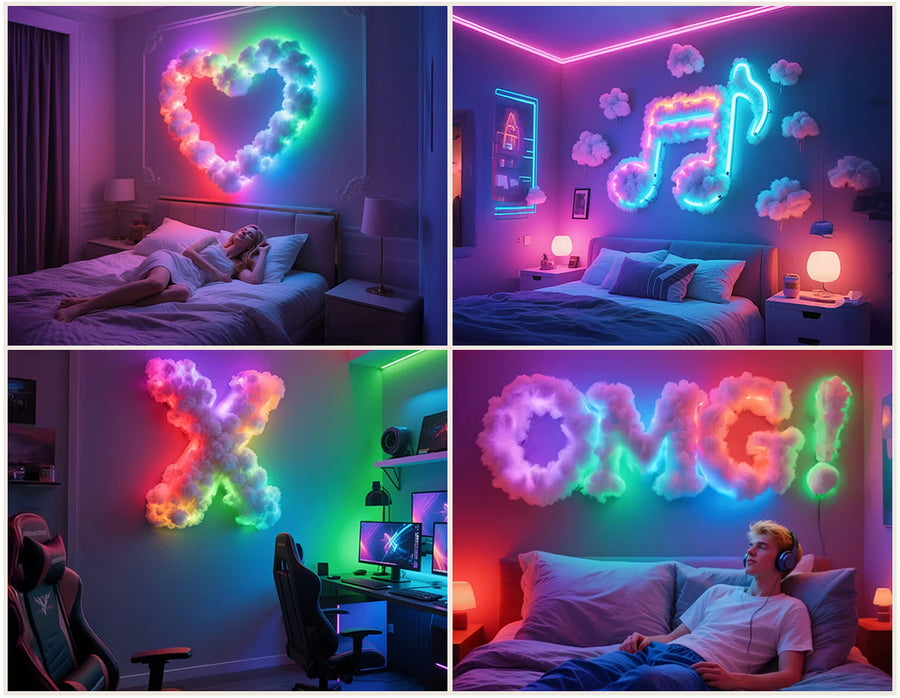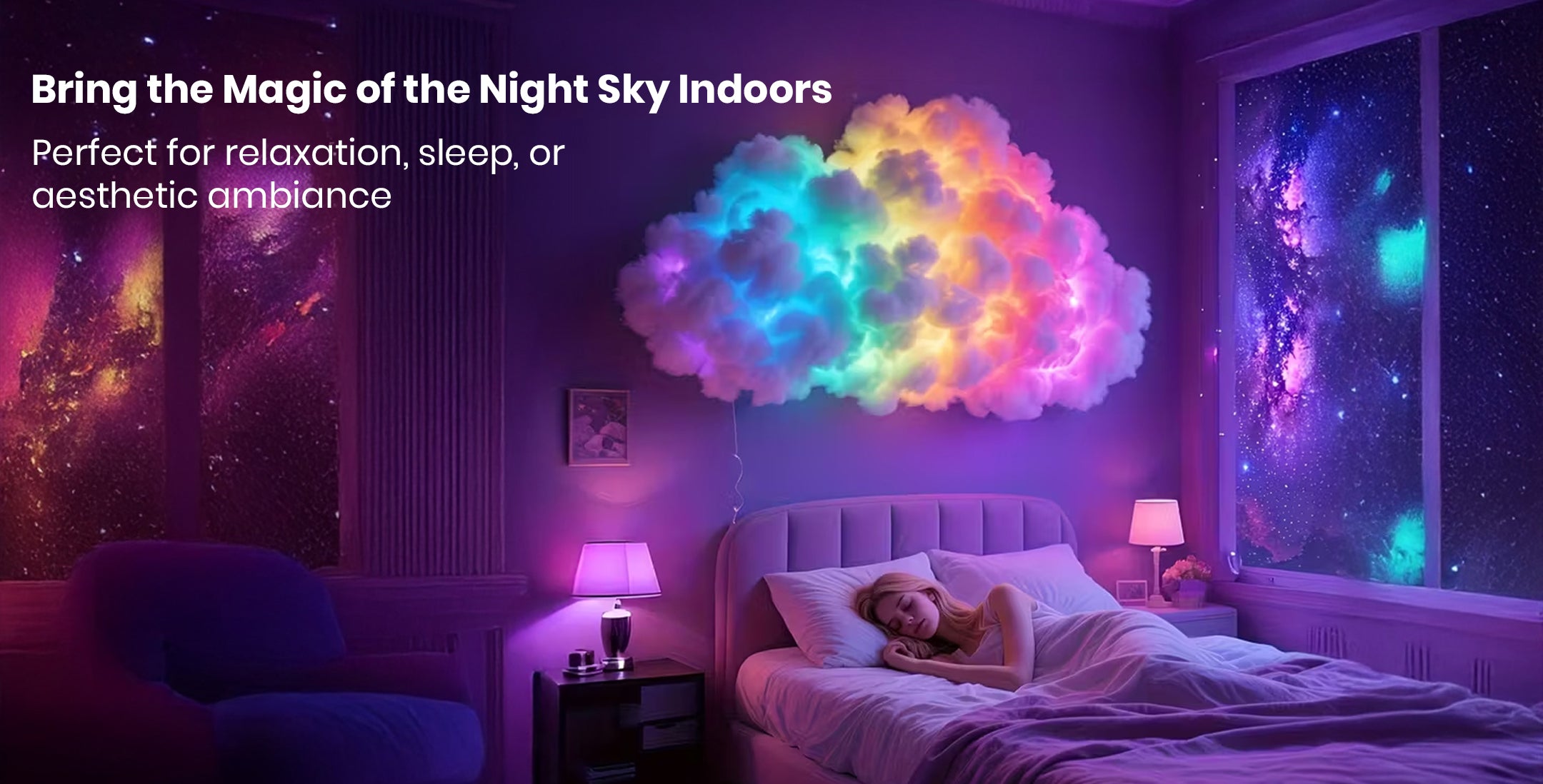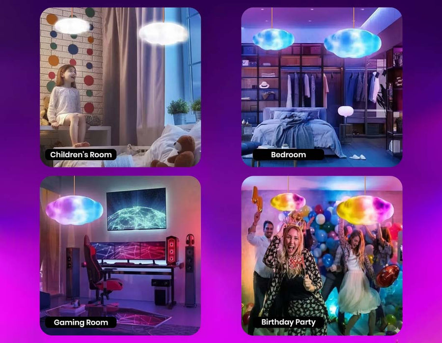 Transform your space into a dreamy, aesthetic paradise with the TECPHILE 3D Customizable DIY Cloud Light with App & Remote Control — the ultimate RGBIC ceiling light for creativity, mood lighting, and personalized décor. Perfect for those who love aesthetic room décor, kids’ room lights, or gaming setup accessories, this DIY kit lets you design realistic, fluffy LED cloud lights that react to your music for a captivating, immersive experience. Featuring App, Remote, and Control Box control, you can explore 16 million colors, 200+ dynamic lightning effects, music sync modes, and adjustable brightness to match your vibe. Whether used as a bedroom ceiling light, TikTok room light, wall lamp, or studio backdrop, this color-changing RGB cloud light adds a unique touch to any room. With easy, tool-free installation and premium materials, it’s perfect for home décor, gaming rooms, creative studios, and content creators looking to elevate their space with modern, smart lighting.