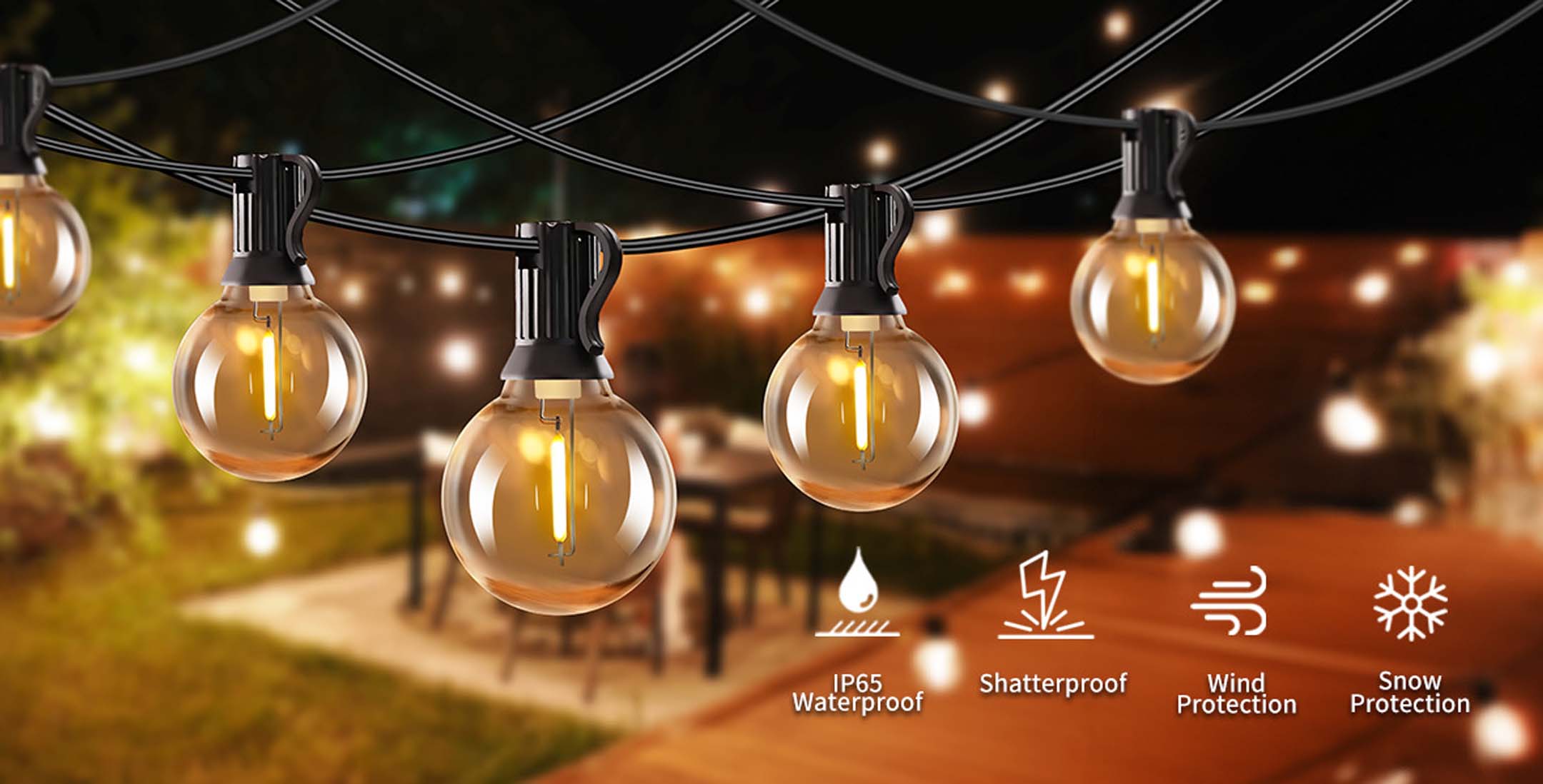 These G40 decorative string lights Available in 15ft, 25ft, and 40ft lengths to suit various spaces, feature 0.6W energy-saving LED bulbs, reducing electricity use by 80%. Made from shatterproof premium plastic with commercial-grade copper and PVC wiring, they are sturdy and weather-resistant. With an IP65 waterproof rating, they withstand rain, wind, and extreme temperatures for reliable indoor and outdoor use. waterproof outdoor string lights has built-in hook allows for easy installation and storage. The warm, romantic glow enhances any space, from patios to living rooms. Plus, the end-to-end connection supports up to 150 bulbs, waterproof outdoor string lights making them ideal for larger areas.