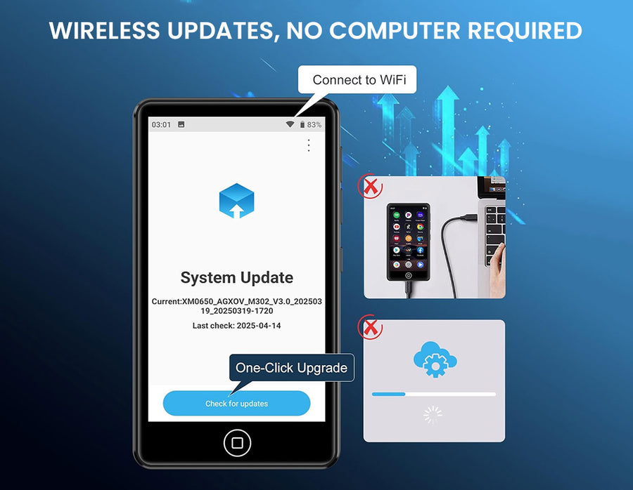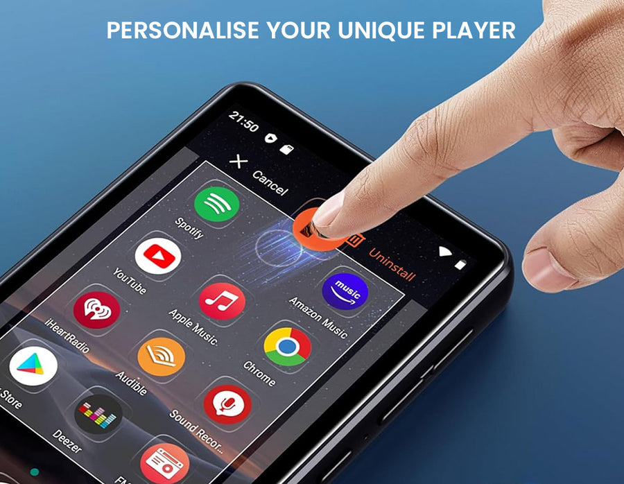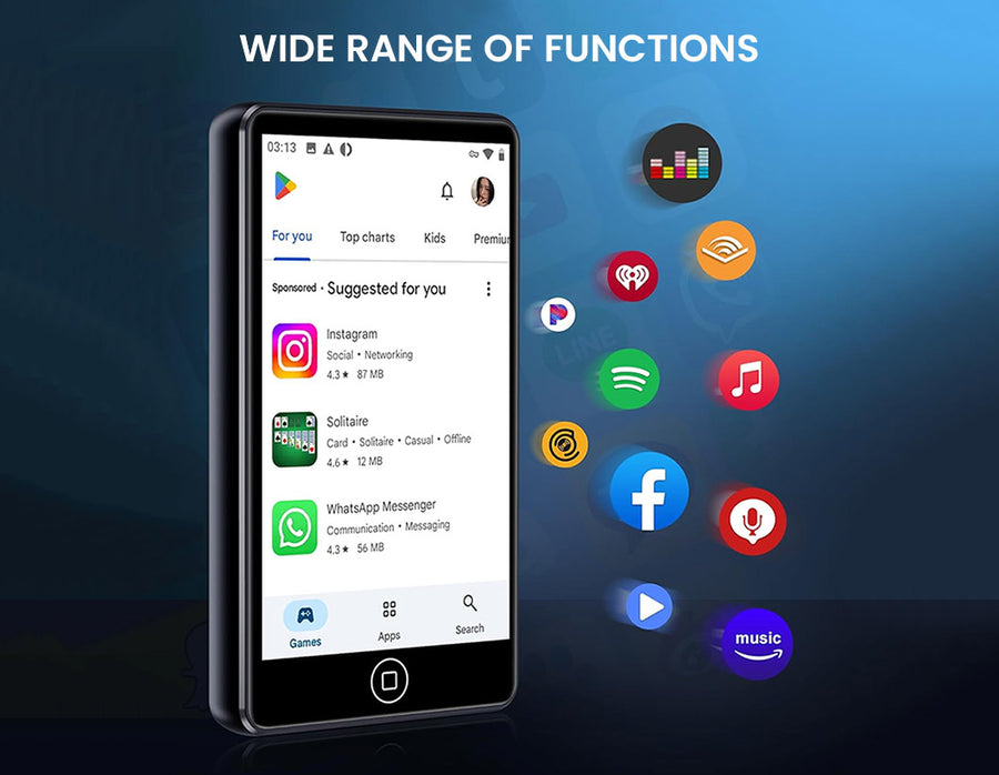Enjoy music anywhere with the AUDIOCULAR M302, a portable Android-powered MP3/MP4 player featuring Bluetooth, WiFi, and HiFi sound quality. Equipped with a 4.02” touchscreen, 16GB storage (expandable to 512GB), and a 2000mAh battery for up to 50 hours of playback, it’s perfect for travel, workouts, and daily use. Preloaded with Spotify, Amazon Music, and Audible, the M302 makes streaming effortless while supporting a wide range of audio and video formats.