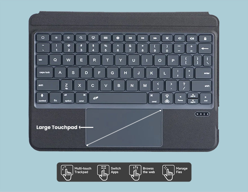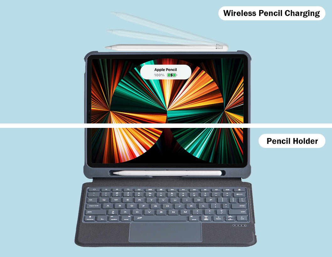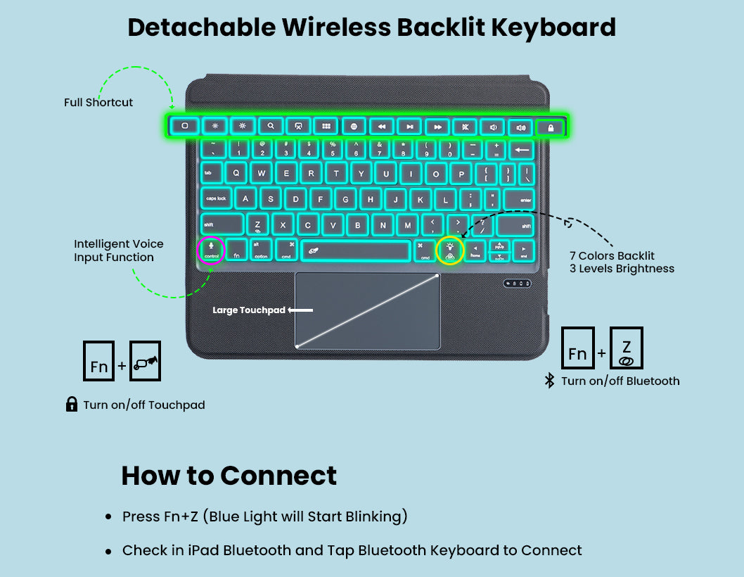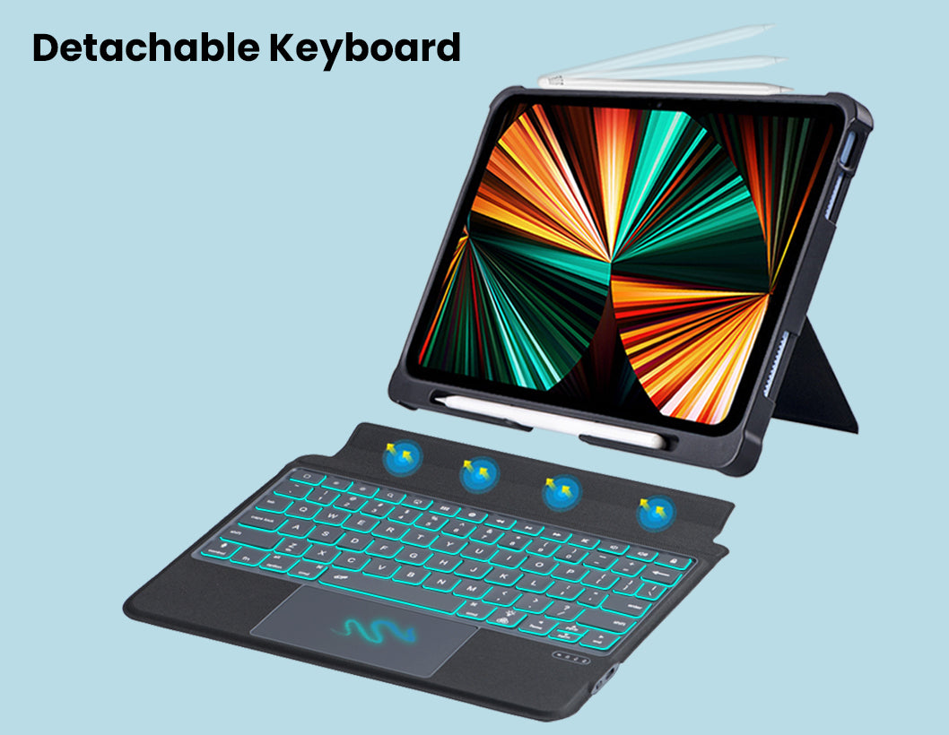 The iPad case with a detachable keyboard offers a multifunctional solution for users, featuring a large touchpad, 7 color backlight, and multiple viewing angles.