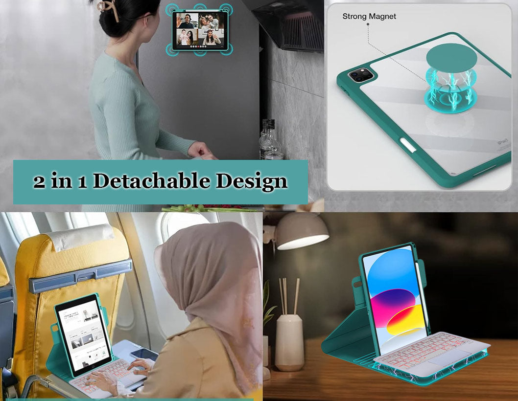 This 3-in-1 keyboard case and transparent cover are specifically tailored for the New 2022 iPad 10th Generation (10.9-inch) and models no. A2696, A2757, A2777. Easily transform your iPad into a laptop by magnetically attaching it to the back cover, connecting the wireless keyboard, and placing your stylus Pencil on top. Enjoy multiple viewing angles with its 360-degree rotating design and adjustable stand options. The built-in multi-gesture trackpad allows for seamless navigation, while the sturdy construction provides ultimate protection against shocks and drops. Portable and convenient, it's perfect for work, study, or entertainment on the go.
