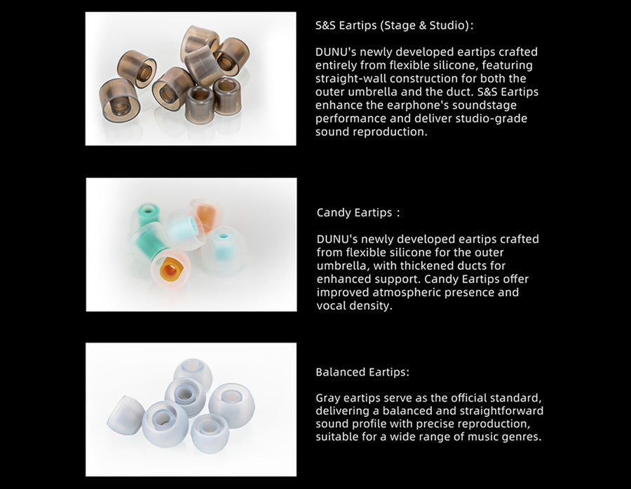 - 1x Premium ear tips set (DUNU S&S, Candy, Balanced tips)