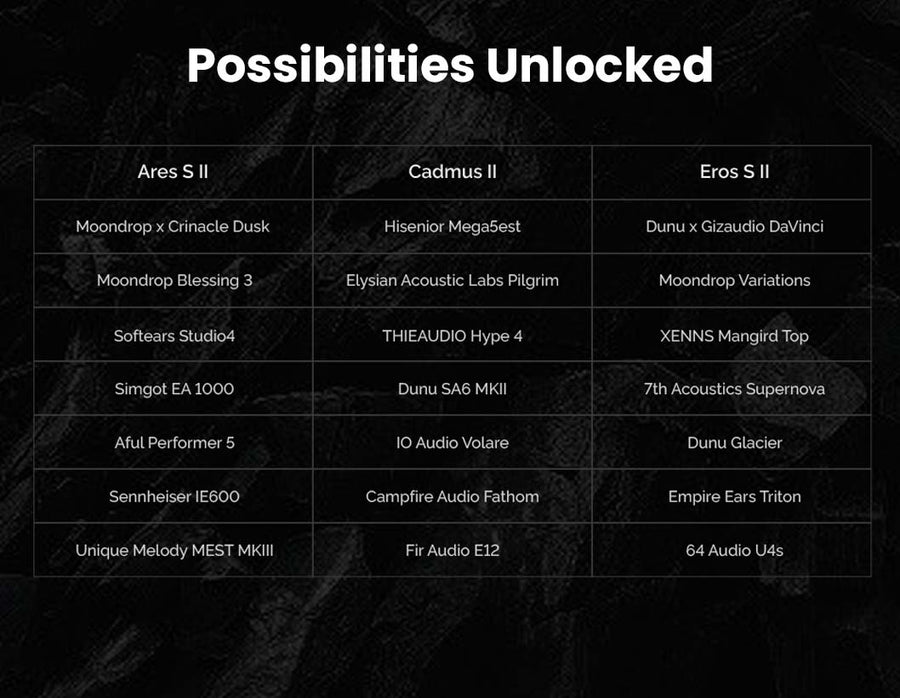 The Signature Series II was rigorously tested with a wide range of IEMs to ensure optimal compatibility. We aimed to provide the best pairing experience for audiophiles, regardless of the IEM model. The Ares S II has been tested with popular IEMs such as Moondrop x Crinacle Dusk, Moondrop Variations, Moondrop Blessing 3, Softears Studio4, THIEAUDIO Hype 4, Dunu SA6 MKII, Sennheiser IE600, Campfire Audio Fathom, Empire Ears Triton, Unique Melody MEST MKIII, Cadmus II, and 64 Audio U4s, among others.