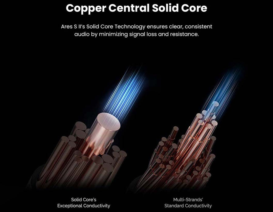 The Effect Audio Ares S II is built with a 26AWG 8-wire configuration that offers significant ergonomic improvements, enhancing both flexibility and portability for a more comfortable and customizable listening experience. It introduces Copper Central Solid Core technology from the CODE Series, using a single, continuous conductor to eliminate gaps and reduce resistance. This results in improved conductivity and cleaner, more accurate audio transmission, especially at higher frequencies, ensuring a superior listening experience.