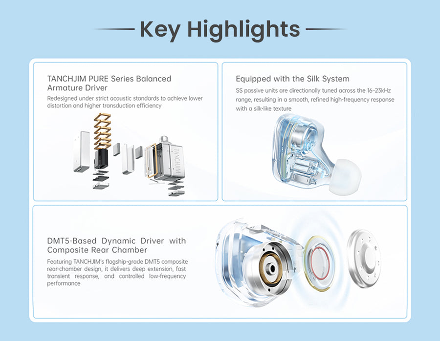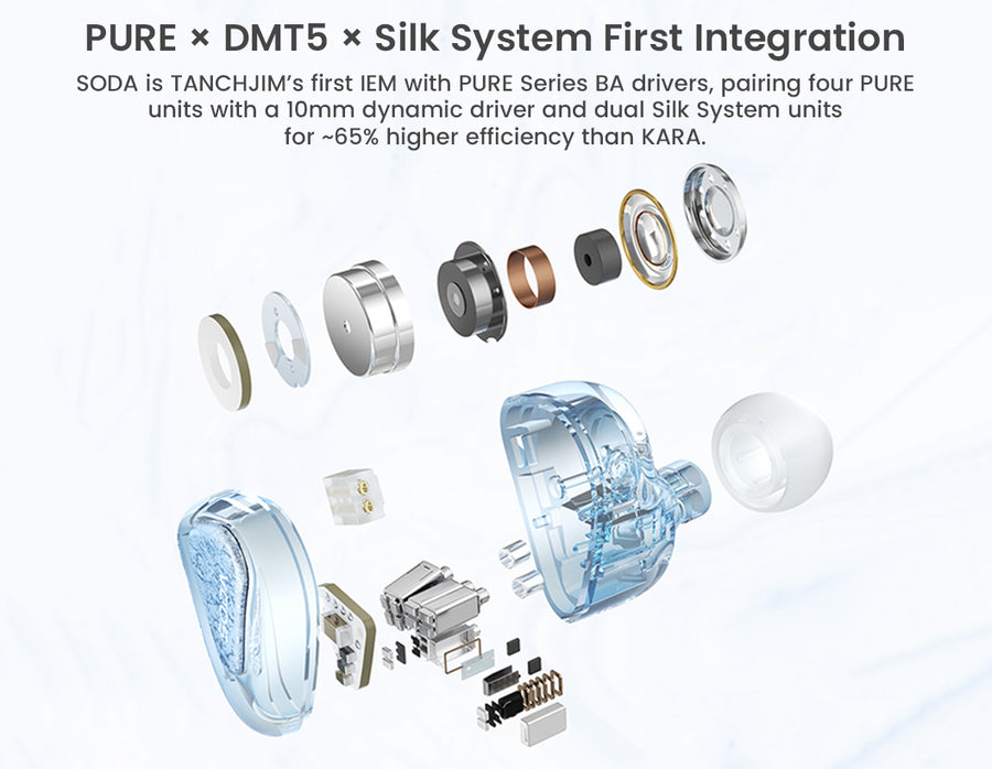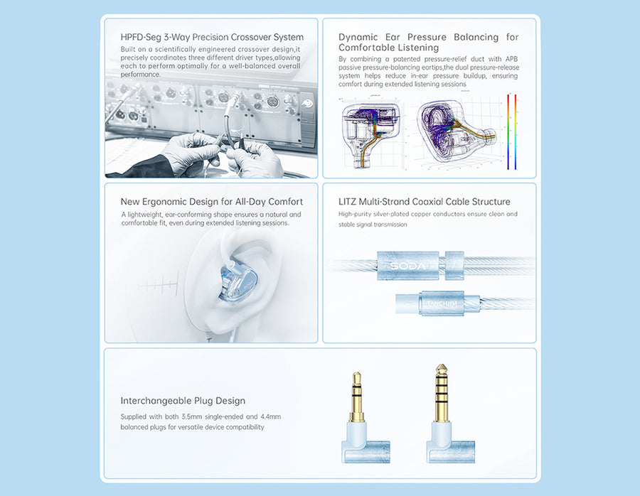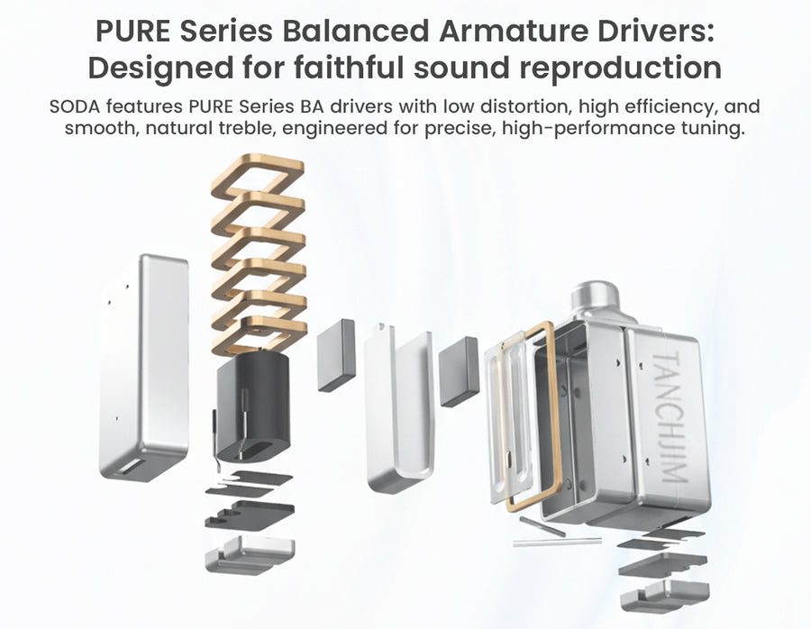 Discover precision-engineered audio excellence with the TANCHJIM SODA hybrid IEMs, featuring an advanced 1DD+4BA+2 passive driver configuration including the flagship 10mm DMT5 dynamic driver for deep, controlled bass and fast transients. Paired with 4 PURE balanced armature drivers for accurate mids/highs and Silk System passive units tuned at 16-23kHz for smooth treble detail, plus HPFD-Seg 3-way precision crossover for seamless integration and coherent soundstaging. The premium silver-plated Litz cable offers interchangeable 3.5mm/4.4mm plugs, while patented acoustic shells with dual pressure-release system ensure extended comfort and natural timbre across all music genres—ideal for audiophiles, gamers, and daily listeners.