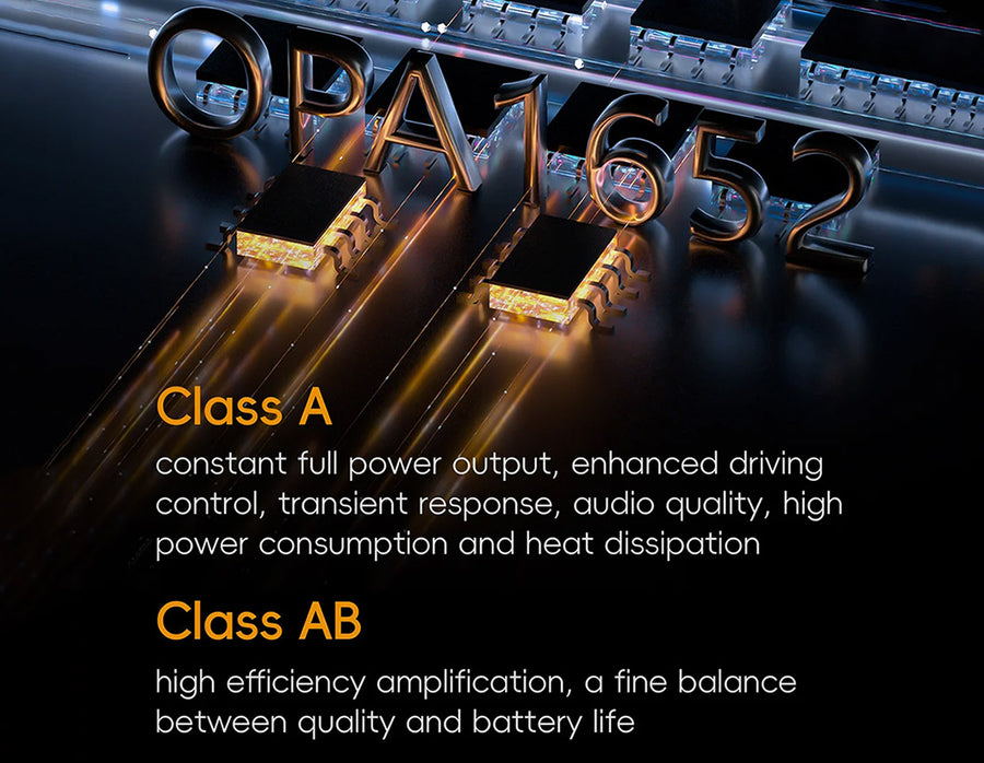 The R6iii 2025 has dual OPA1652 operational amplifiers and 16 hand-matched transistors, ensuring zero crossover distortion and instantaneous transient response. This amplification system delivers unmatched audio dynamics and is complemented by four ELNA capacitors. With the switchable Class A and AB modes, you can choose the optimal amplification style—Class A for full-power output that drives even the most demanding headphones, and Class AB for a high-efficiency balance between sound quality and battery life.