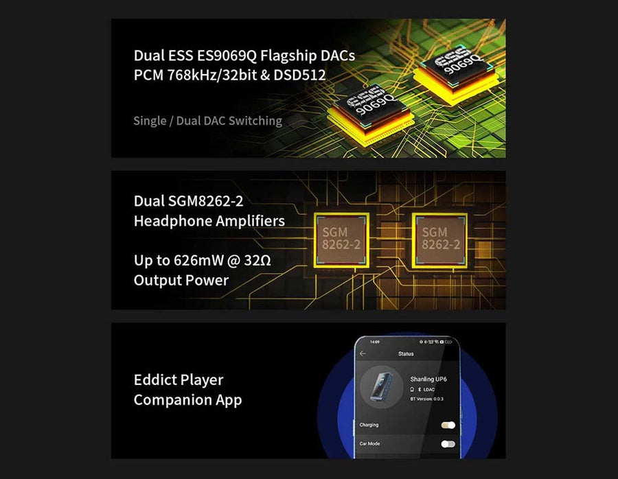 Embark on a transformative audio adventure with the Shanling UP6, a pocket-sized HiFi masterpiece that elevates any device into a portable music haven! Powered by dual ESS Sabre ES9069Q DAC chips, dual SGM8262 amplifiers, and a Qualcomm QCC5125 Bluetooth chip, this audiophile-grade DAC/AMP delivers a stunning 130 dB SNR and 120 dB dynamic range for studio-quality sound. Stream wirelessly with LDAC, aptX HD, or aptX Low Latency, or connect via USB-C for lossless PCM up to 32-bit/768kHz and DSD512 playback—all certified for Hi-Res Audio and Hi-Res Audio Wireless. With NFC for effortless pairing, a 10-band parametric equalizer, CVC 8.0 noise-cancelling calls, and up to 6.5 hours of battery life, the UP6 is the ultimate portable DAC/AMP for audiophiles craving pristine, high-fidelity sound anywhere.