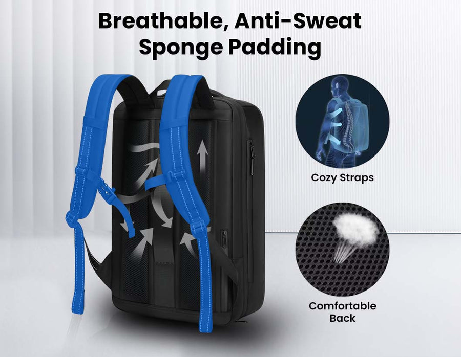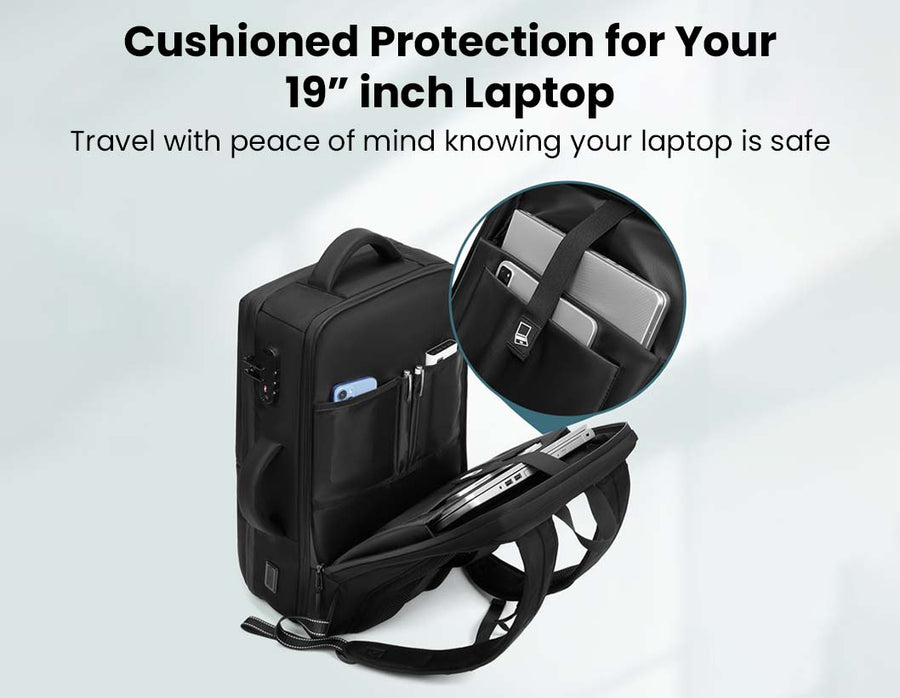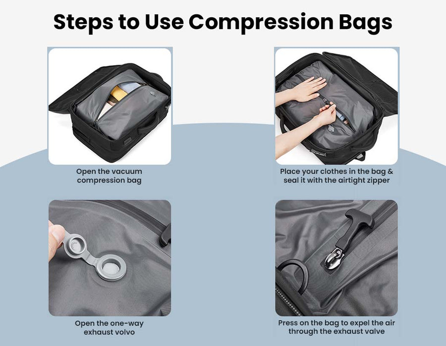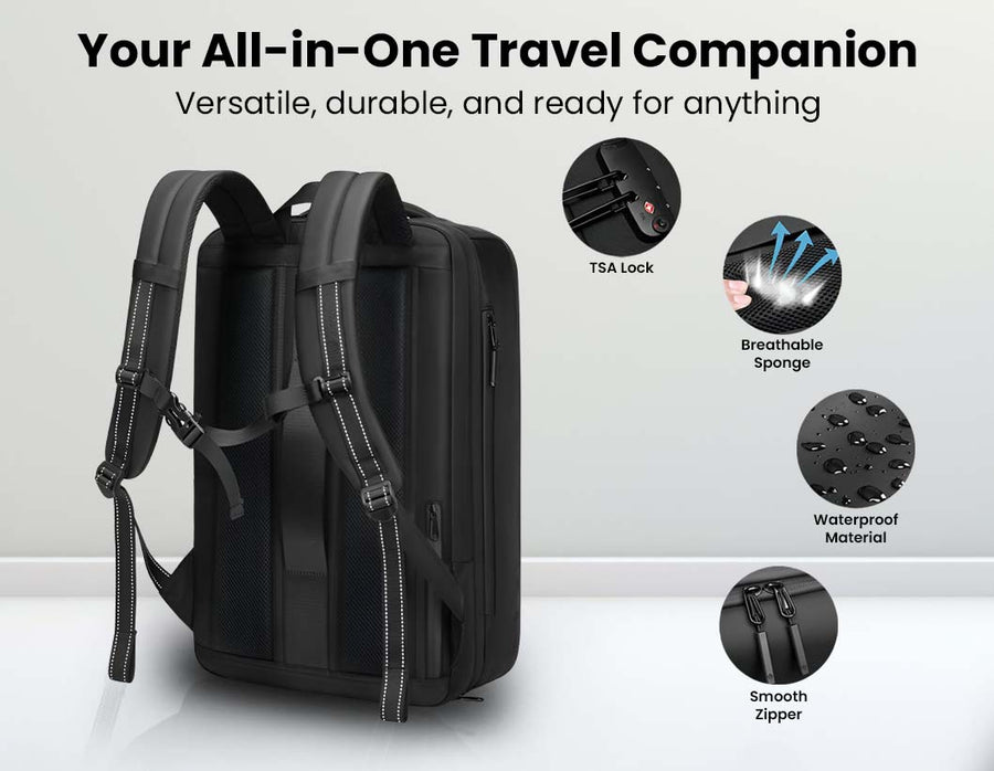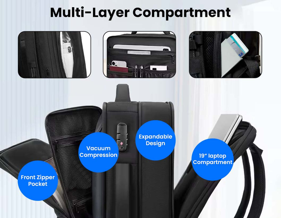 Experience unparalleled convenience and reliability with TECPHILE JL-152A, a Smart Airpack or a Travel Vacuum Backpack, designed to meet the needs of men, women, and students alike. Constructed from robust 900D Oxford cloth featuring a waterproof finish and polyester lining, this travel bag is engineered to endure diverse outdoor and daily use scenarios. Offering a generous capacity of 39-55 liters, premium double-sided smooth zippers, and versatile storage solutions, it integrates practicality with an advanced vacuum compression system inspired by vacuum-sealed bags to optimize packing efficiency. This premium travel backpack caters effectively to adventurers, professionals, students, and office users, incorporating a trolley sleeve design, adjustable shoulder buckle, chest strap, silver-coated side pocket (wet pocket), anti-theft pocket and a TSA lock for superior comfort and protection.