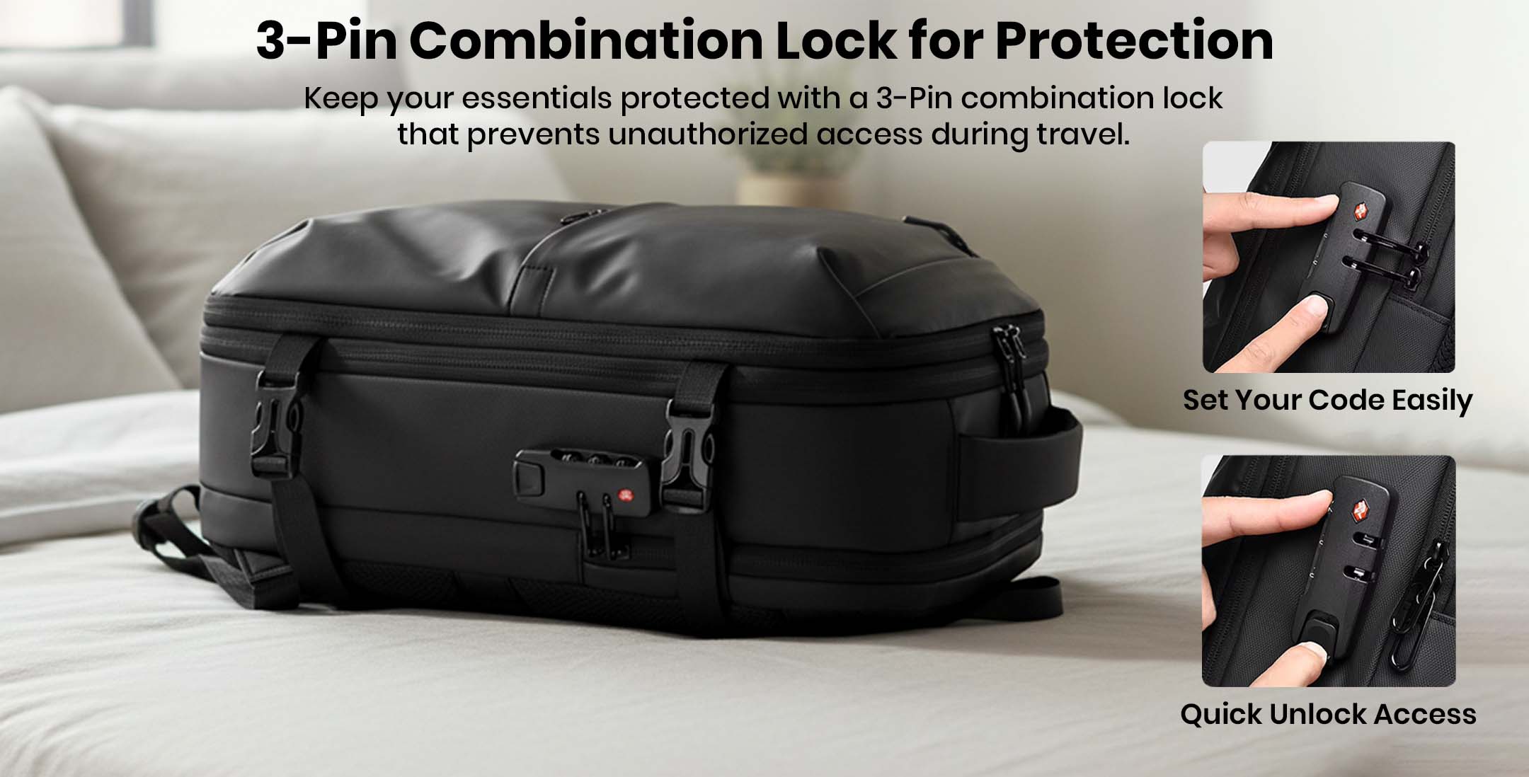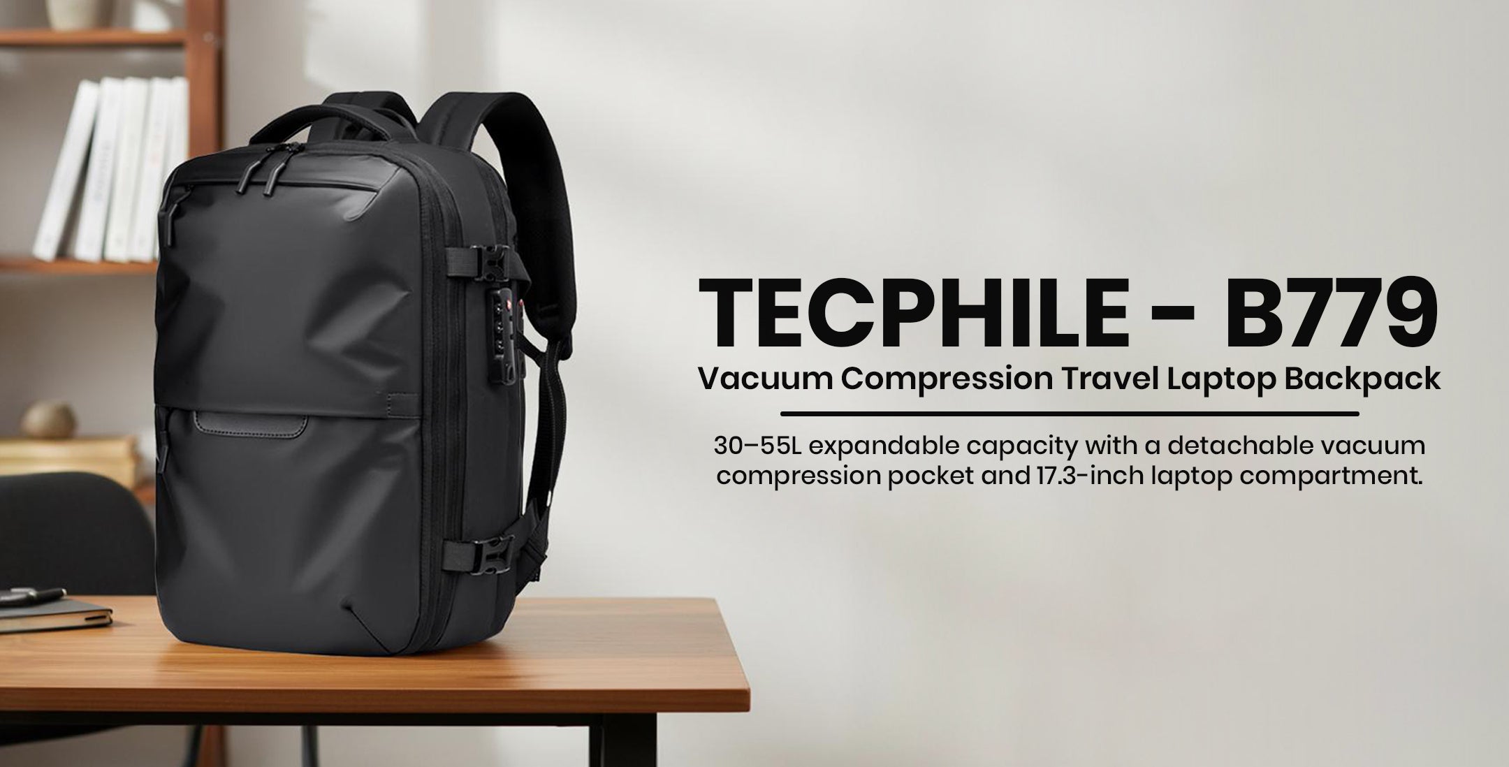 The TECPHILE B779 Vacuum Backpack Travel Laptop Bag is the ultimate solution for modern travelers looking for a combination of style, function, and security. Designed for versatility, it features a spacious 30L-55L expandable capacity that fits laptops up to 17.3 inches and includes multiple compartments for organized packing. The highlight of this travel backpack is the detachable vacuum compression pocket with an electric pump, allowing you to compress your clothes and gear, optimizing space and reducing bulk. Built from waterproof Oxford cloth and equipped with rust-free zippers, this bag is durable, long-lasting, and weather-resistant, ensuring your belongings stay safe, dry, and organized during all your travels. The anti-theft combination lock and ergonomic features, such as the breathable back panel and adjustable chest strap, offer unparalleled comfort and security, whether you’re navigating an airport or exploring rugged landscapes. Perfect for business trips, hiking, or everyday commuting, the TECPHILE B779 combines practicality and comfort with its quick-access front pocket, side bottle pocket, and dry/wet separation for maximum convenience and organization. Travel with ease and confidence, knowing your essentials are securely packed and easily accessible.