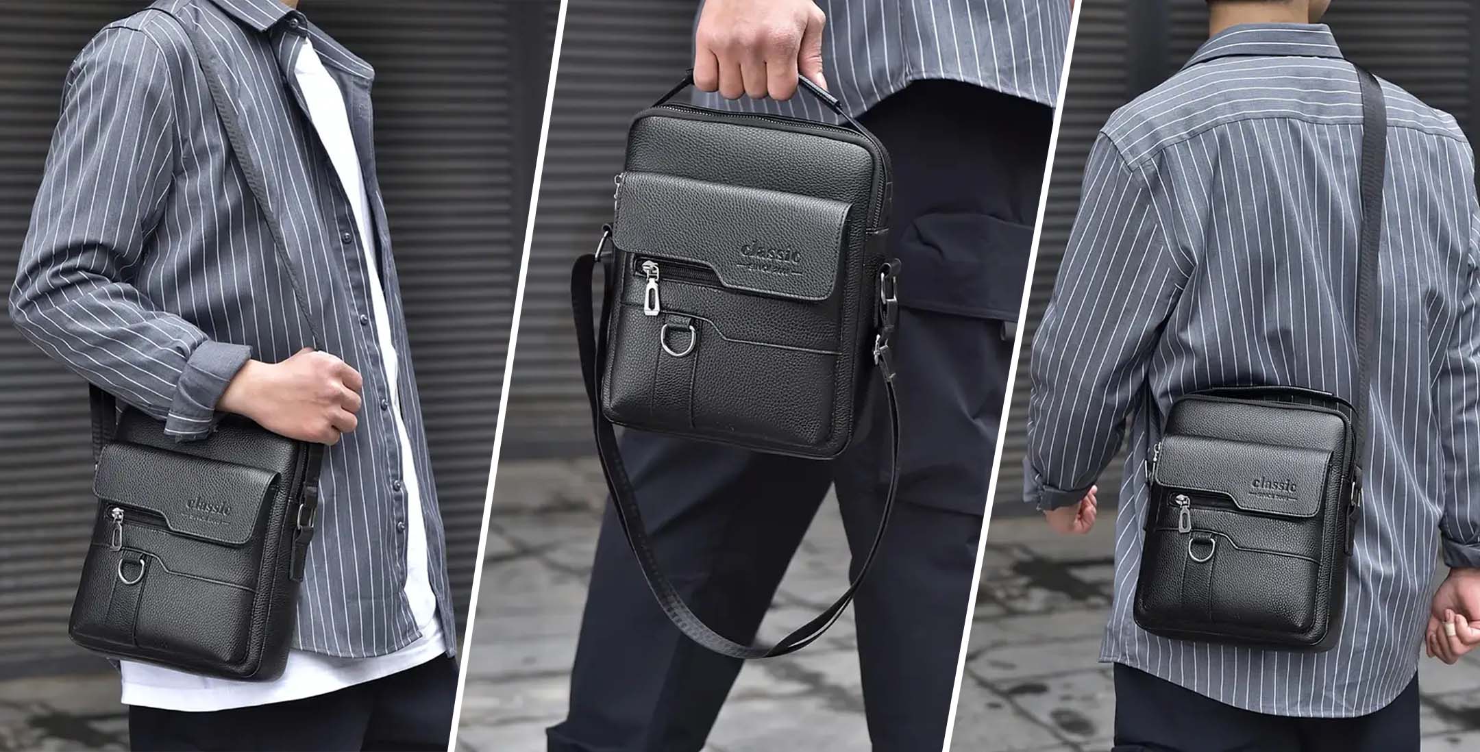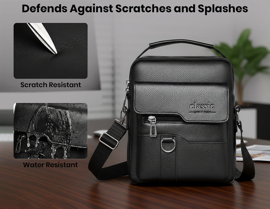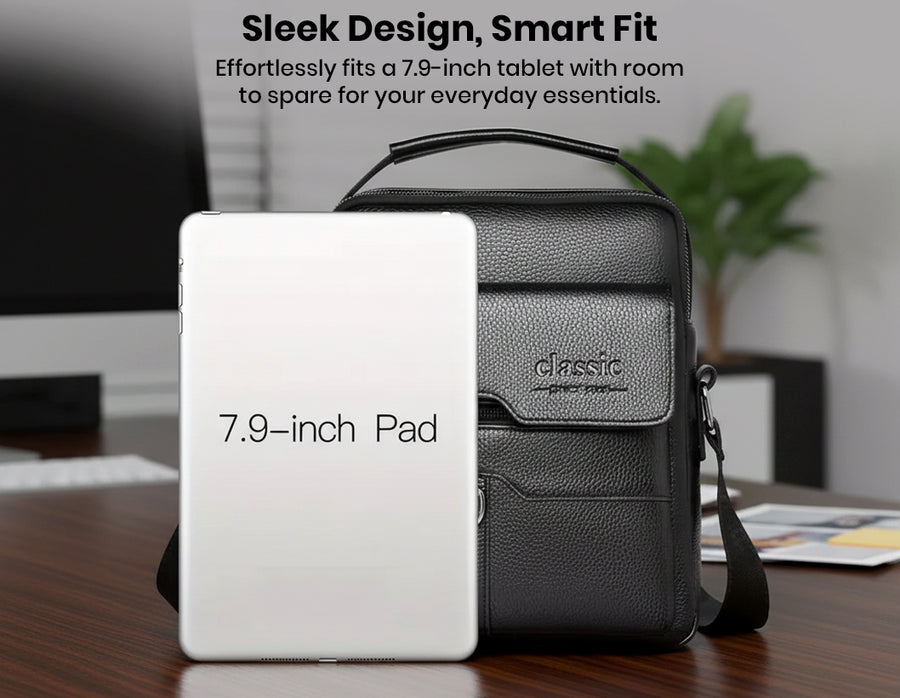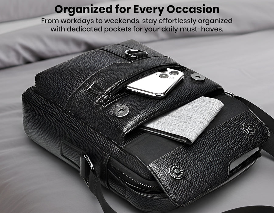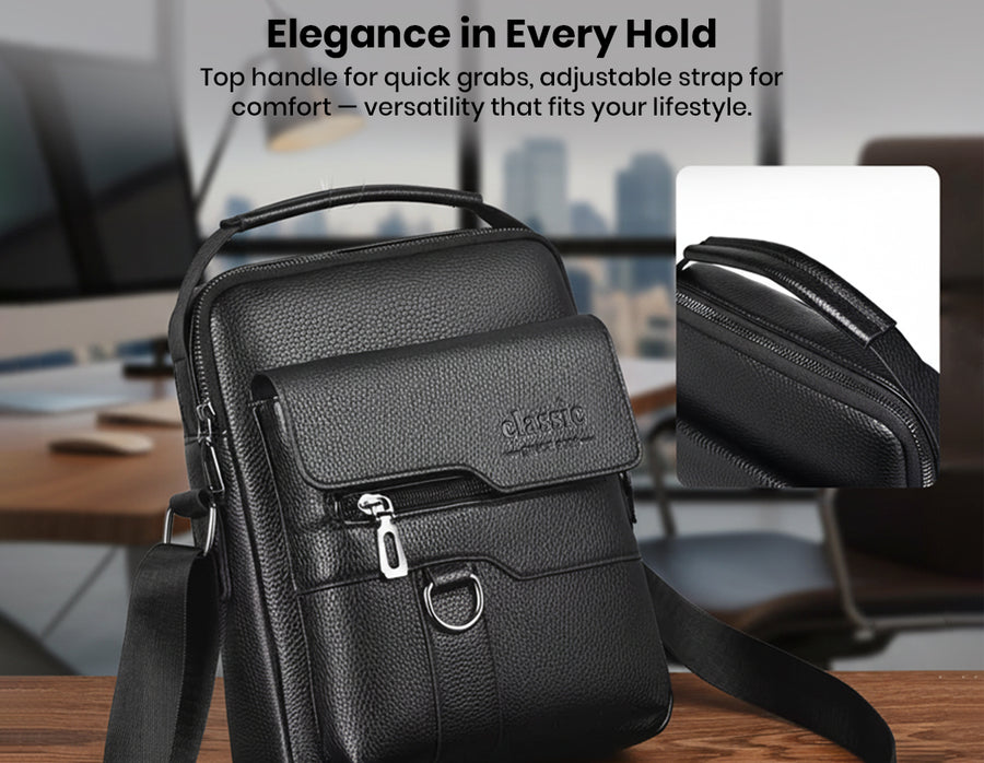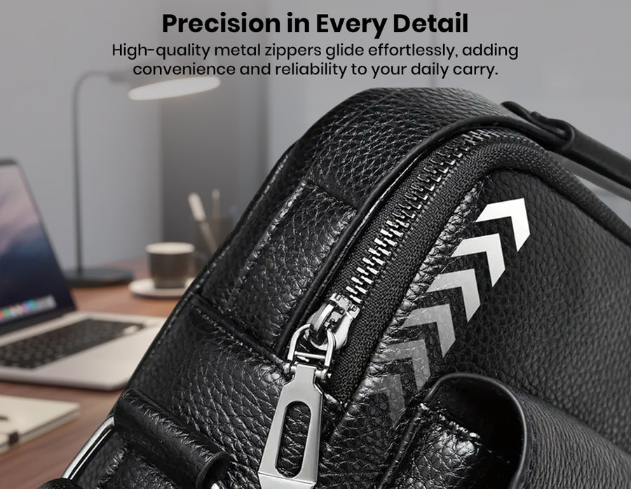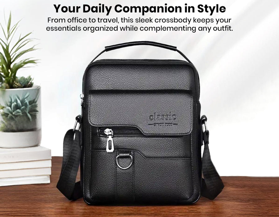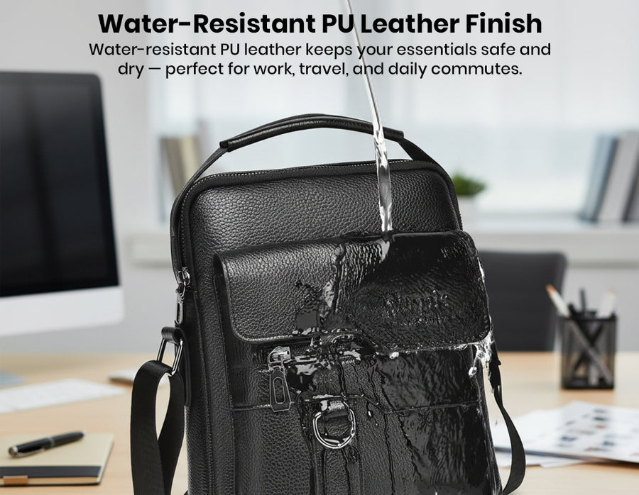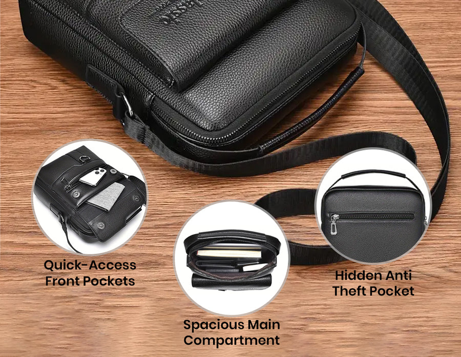 This premium PU leather sling bag offers a sleek, durable design with a spacious main compartment and quick-access front pockets. It features a hidden anti-theft back pocket for extra security, along with an adjustable shoulder strap and top handle for versatile carrying. Compact and lightweight, it's perfect for both casual and professional use, complementing any outfit.