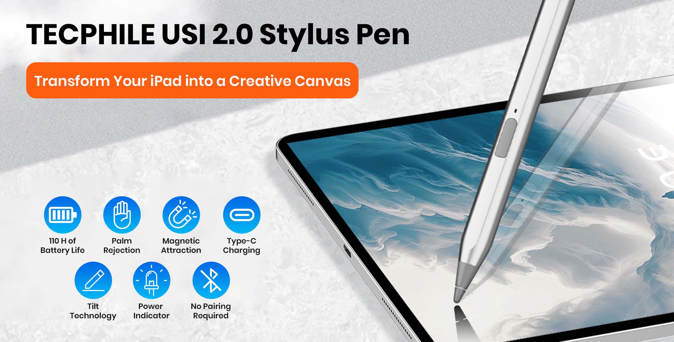 Unlock Your Digital Potential with the TECPHILE UC10 Stylus Pen which allows you to experience unparalleled digital creativity and productivity. Designed to seamlessly integrate with USI 2.0-enabled Chromebooks and tablets from top brands like Acer, Lenovo, HP, and Samsung, this precision tool offers effortless control and creativity. With its sleek design, durable nib, and impressive 110-hour battery life, this stylus is perfect for anyone looking to elevate their digital creativity. Enjoy uninterrupted creation with power-saving features like auto-sleep mode and auto-shutdown. Stay focused with the convenient LED light indicator, two function buttons, and ergonomic design that lets you work for hours without fatigue. Plus, recharge quickly and easily with the USB-C charging port.