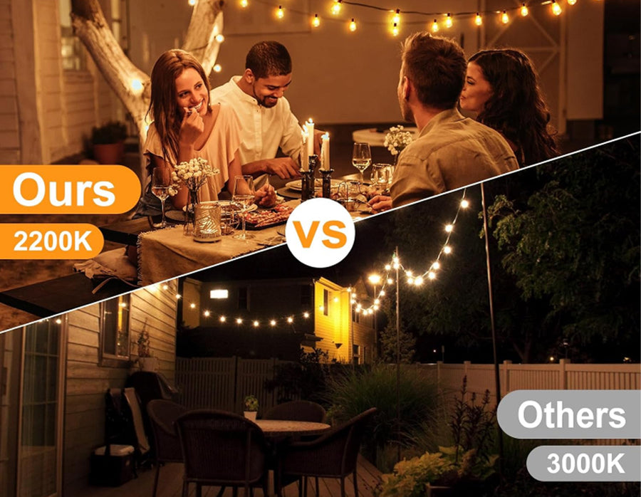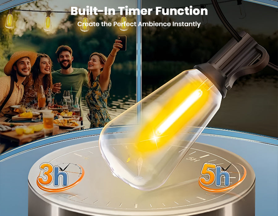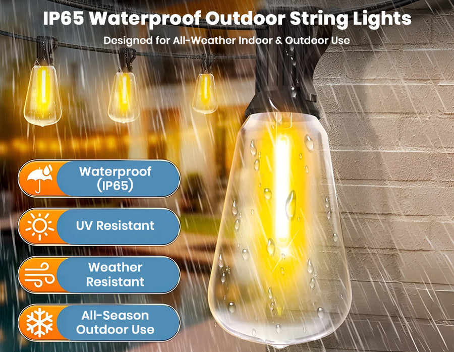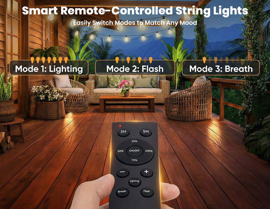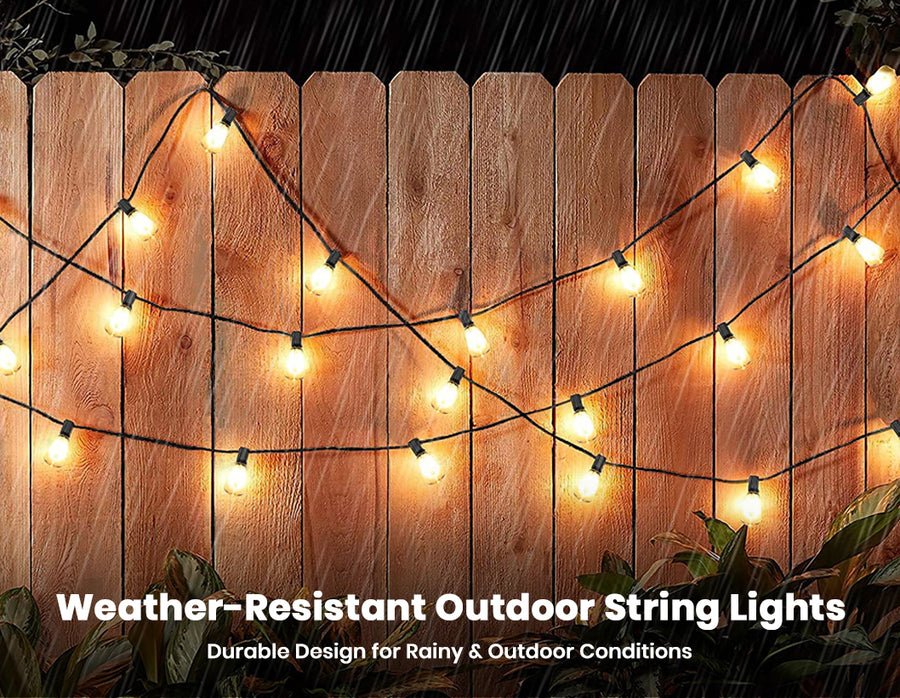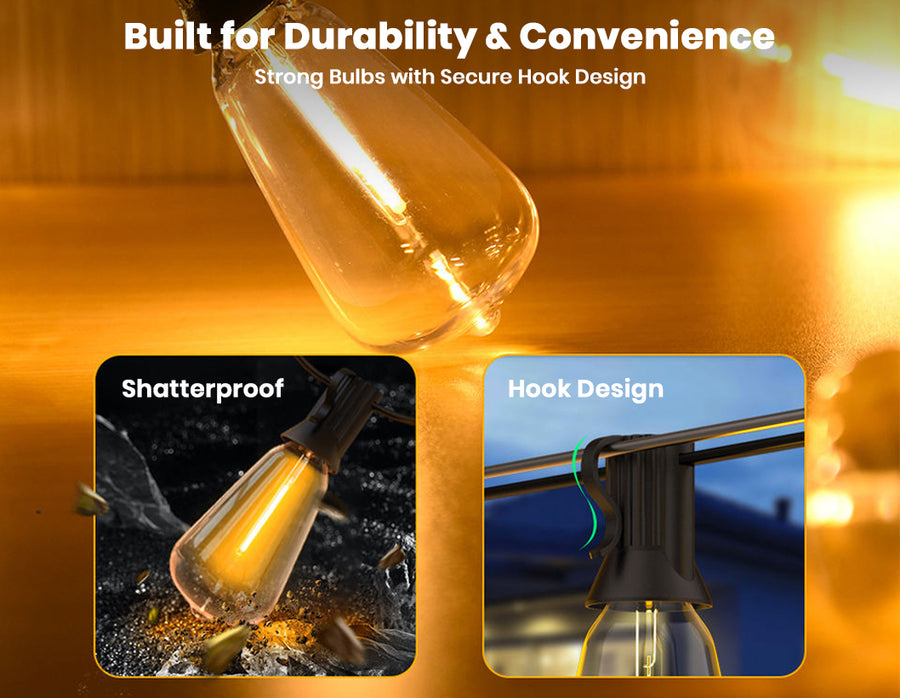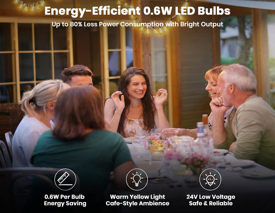 Create a warm and inviting atmosphere with these 50ft outdoor LED string lights featuring dimmable ST38 bulbs and remote control operation. Designed for both indoor and outdoor use, these energy-efficient 0.6W LED bulbs deliver bright illumination while consuming up to 80% less power than traditional lights. The shatterproof plastic bulbs, commercial-grade copper wiring, and IP65 waterproof construction ensure long-lasting performance in all weather conditions. With multiple lighting modes, timer functions, and a safe 24V low-voltage system, these decorative string lights are perfect for patios, gardens, balconies, parties, festivals, and everyday home décor.