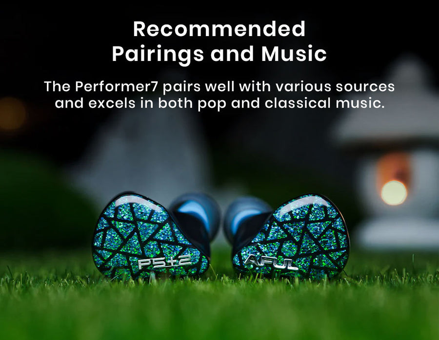 The AFUL Performer 7 is a top-quality in ear monitor (IEM) with a hybrid design that includes 2 dynamic drivers, 4 balanced armature drivers, and a micro planar driver, providing rich bass and clear treble. Its 3D printed acoustic tube, inspired by a Chinese Suzhou garden, offers great sound quality and a beautiful look. The 3D air pressure relief system improves bass and protects your ears, while RLC frequency division technology ensures smooth treble by tuning each driver individually. Comfortable and easy to use, the Performer 7 In ear monitor (IEM) pairs well with various devices and works great across different music genres. This wired IEM comes with a premium 8-core silver-plated copper cable featuring a 0.78mm 2-pin connector and gold-plated plugs in 3.5mm and 4.4mm sizes for a reliable connection, making it an excellent choice for in ear earphone users.