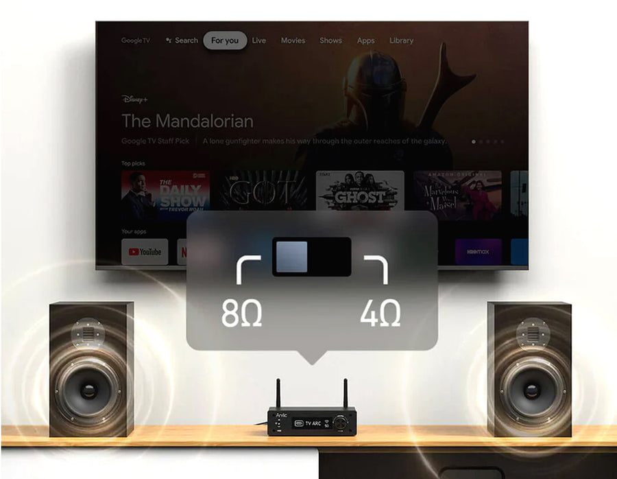 The Arylic H50 Music Streamer is designed to redefine your wireless audio experience, bringing wireless streaming and audiophile-grade performance to any music setup. Built with music enthusiasts in mind, the high-performance ES9023P Sabre DAC chip with advanced streaming capabilities transforms your space into a Hi-Fi audio hub. Powered by Qualcomm QCC3040 Bluetooth 5.2 technology, the high-definition wireless connectivity uses premium codecs like aptX HD, aptX Low Latency, and aptX Adaptive. It also supports multiroom audio via AirPlay 2, Alexa, and Arylic’s proprietary system, enabling synchronized music playback throughout your home. Control your music while the intuitive 4STREAM app offers a 10-band EQ for precise sound tuning. With it's versatile input options—RCA, Optical, HDMI ARC, Phono In, and USB DAC—the H50 seamlessly connects to a wide range of audio sources, from classic vinyl turntables to the latest gaming consoles. It even includes a subwoofer output for deep, immersive bass that completes your soundstage. Whether you're rediscovering old favorites or streaming the latest hits, the Arylic H50 Music Streamer ensures every note is heard just as the artist intended.