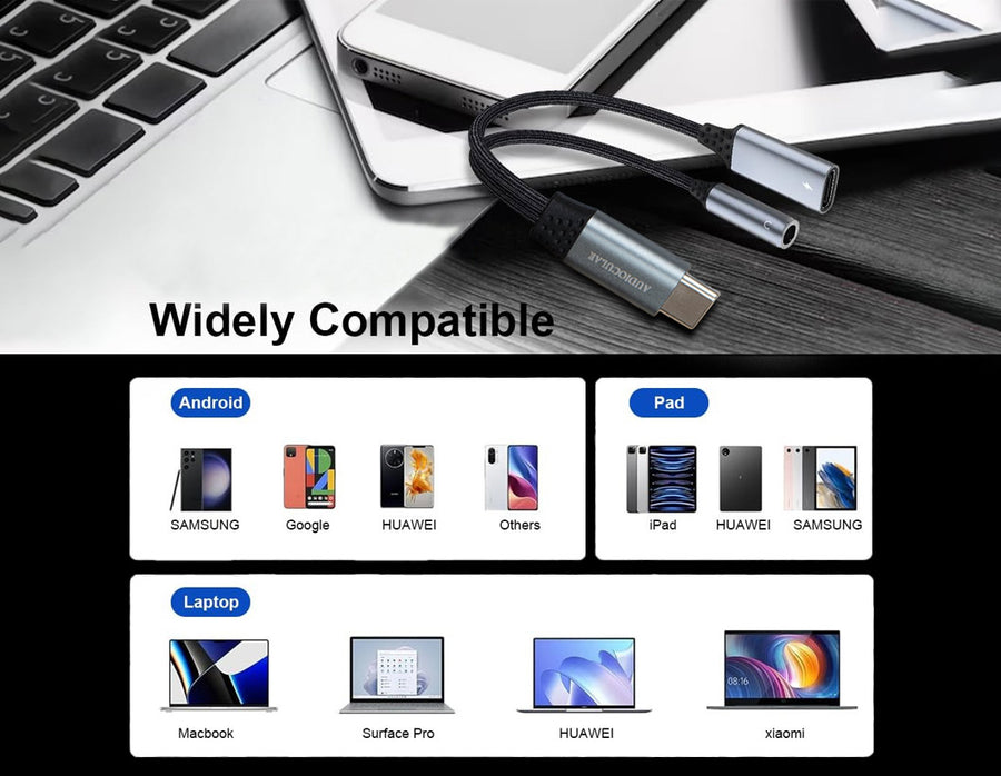 AUDIOCULAR D12 PD is a 2-in-1 USB C to 3.5mm portable DAC dongle featuring the high-performance CX31993 DAC chip, delivering Hi-Res audio up to 32-bit/384kHz. It supports Power Delivery for simultaneous charging and audio playback and is compatible with a wide range of devices, including USB-C phones, tablets, laptops, and gaming consoles. Designed with a durable aluminum alloy shell, it provides enhanced audio with low latency, ideal for gaming. It supports microphones for clear calls and includes a nylon-braided cable for durability.