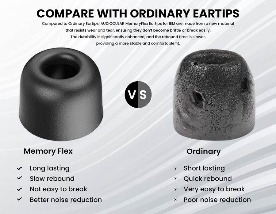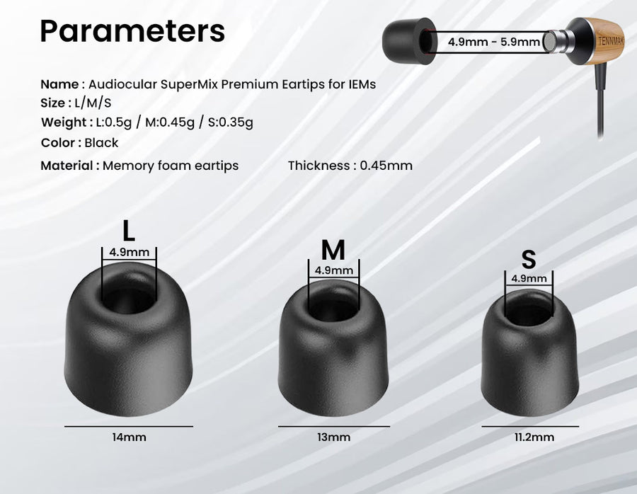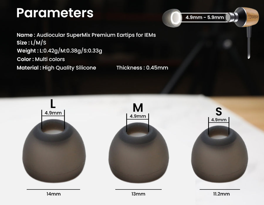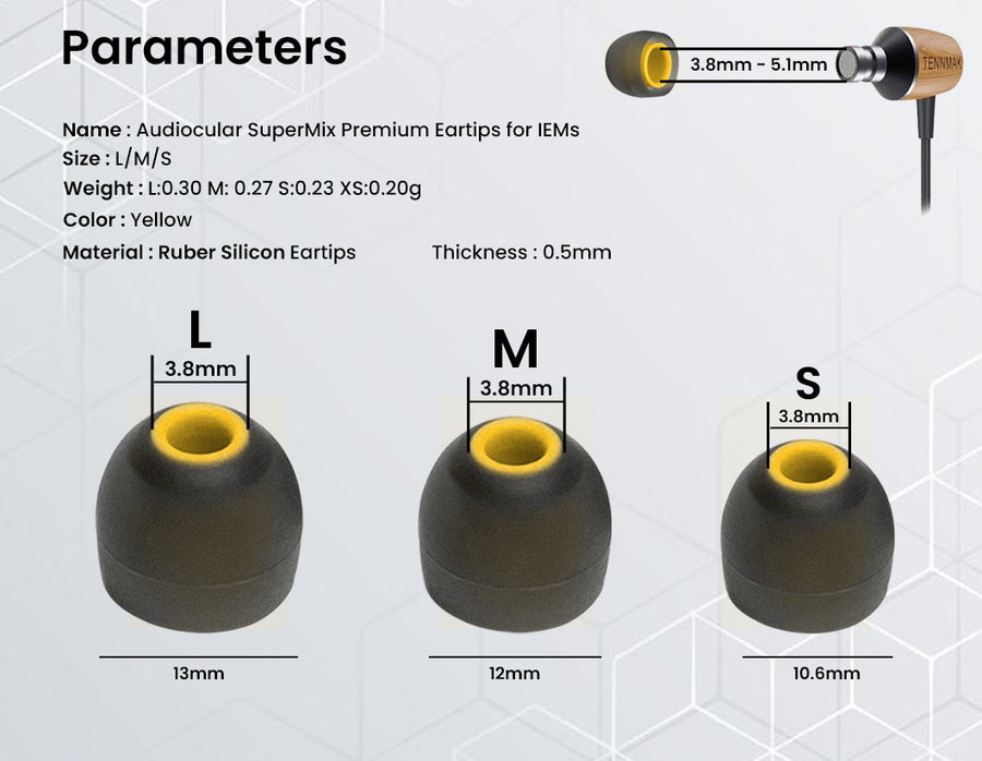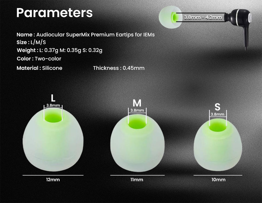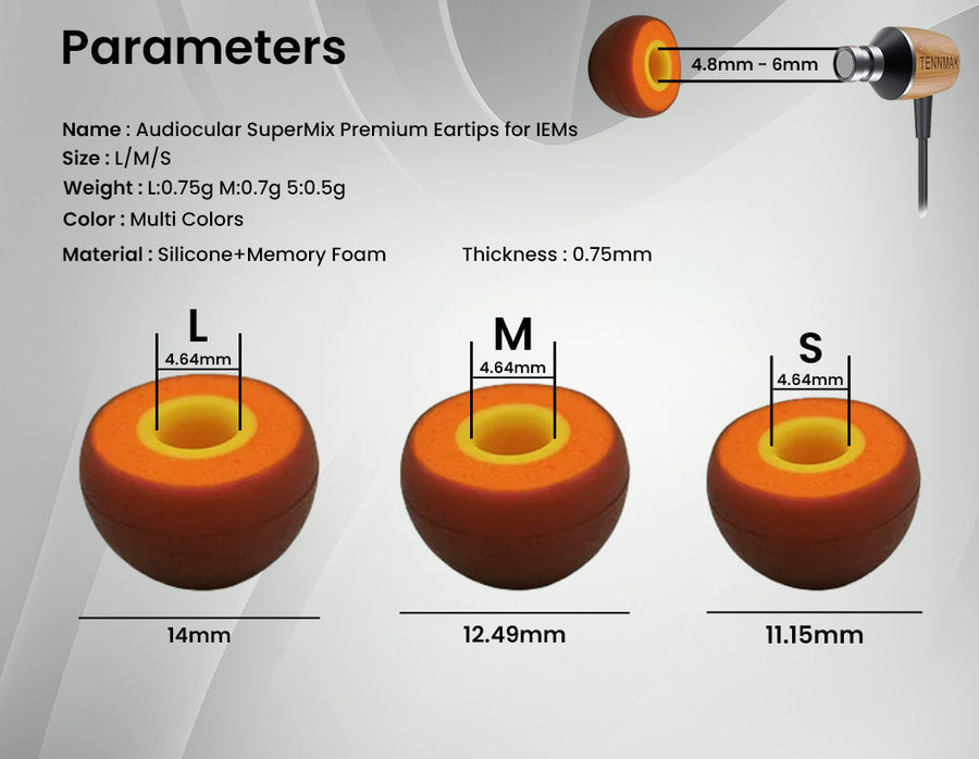 INTRODUCING THE NEW STANDARD IN AUDIO COMFORT: AUDIOCULAR proudly presents the SuperMix 6 Premium Eartips for in ear monitor, a groundbreaking collection that sets a new benchmark in audio comfort and performance. This set contains Six various types of premium Eartips for IEM, all designed in the same size to provide a universal fit. The collection features a variety of materials, including liquid silicone, silicone, memory foam, and a hybrid of memory foam and silicone, catering to diverse listening preferences in one package. Inspired by leading brands like SpinFit, Comply, AZLA and Symbio. The SuperMix 6 eartips for iem offers the ultimate combination of durability, comfort, and enhanced sound quality. Whether you are seeking the rich bass of liquid silicone or the superior noise isolation of memory foam, these Eartips for iem deliver a customized listening experience for every audiophile.