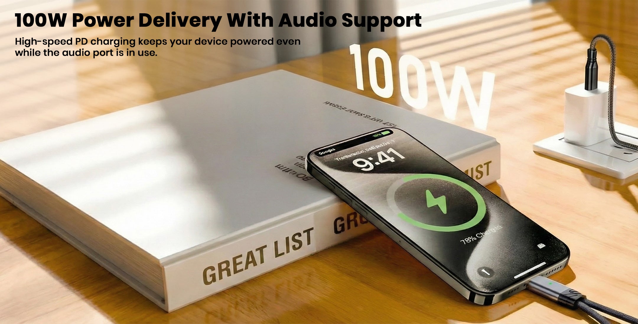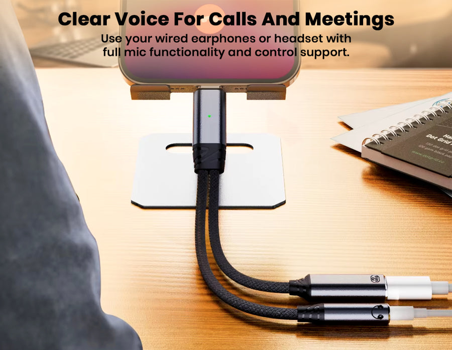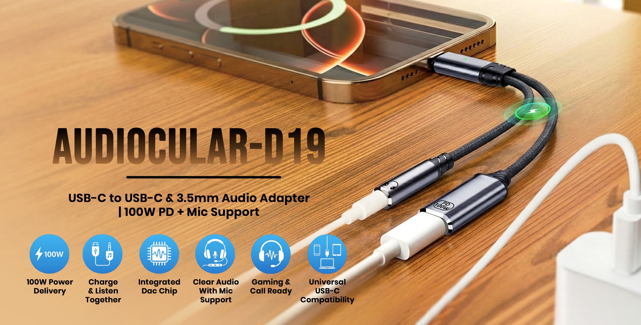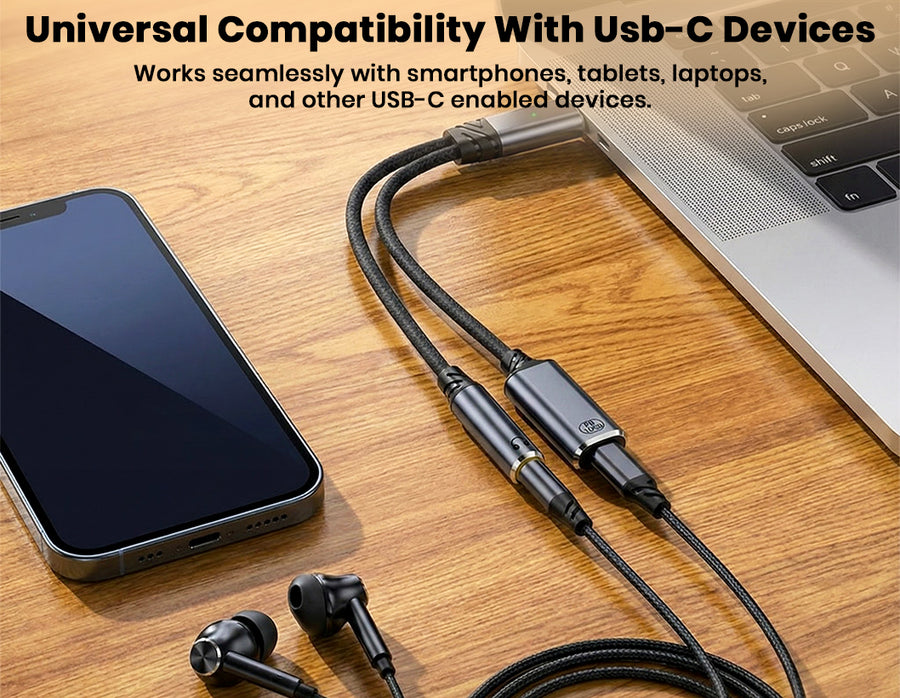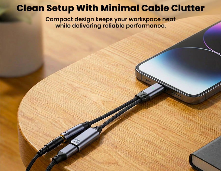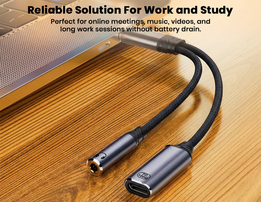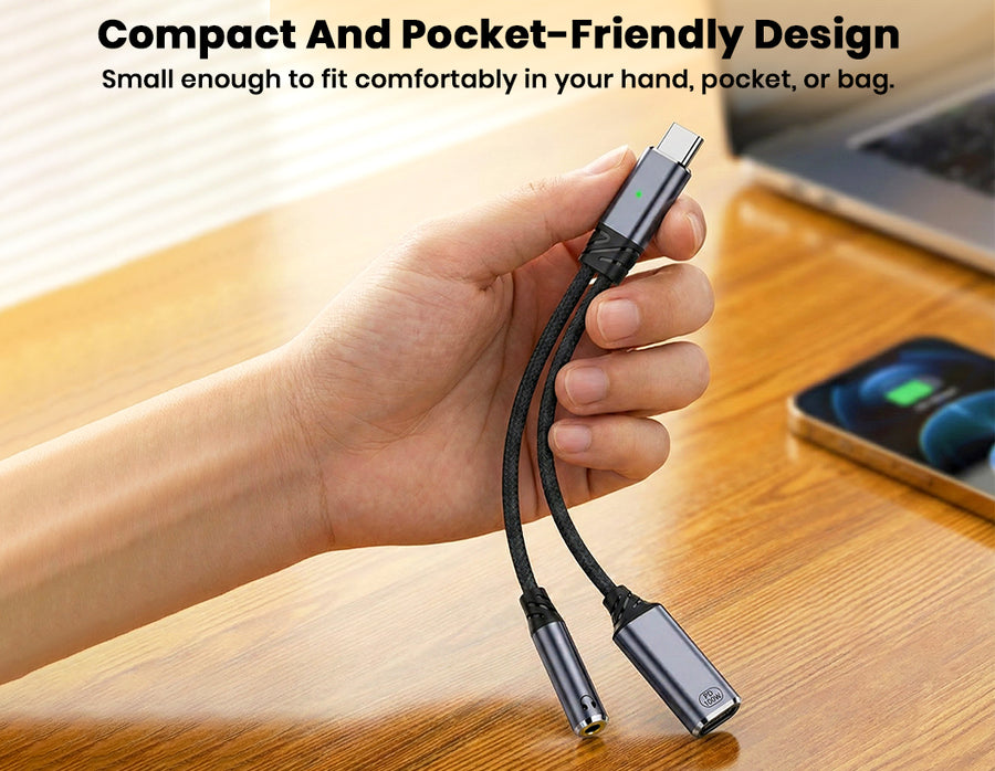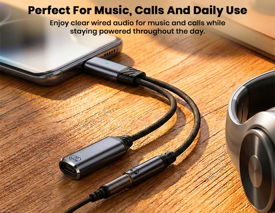 The AUDIOCULAR D19 USB-C Audio & Charging Adapter combines fast 100W Power Delivery charging with high-quality audio in a compact 2-in-1 design, allowing you to listen through a 3.5mm headphone jack while charging your device simultaneously. Its integrated 16-bit / 48 kHz DAC delivers clear, distortion-free sound for music, calls, movies, and gaming, while full microphone and in-line control support lets you handle calls, adjust volume, and manage playback effortlessly. Compatible with a wide range of USB-C smartphones, tablets, and laptops, the D19 ensures stable connectivity, reliable charging, and crisp audio performance—making it perfect for travel, work, online meetings, and everyday entertainment.