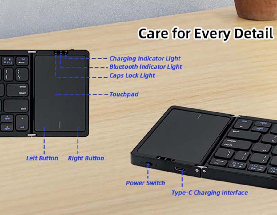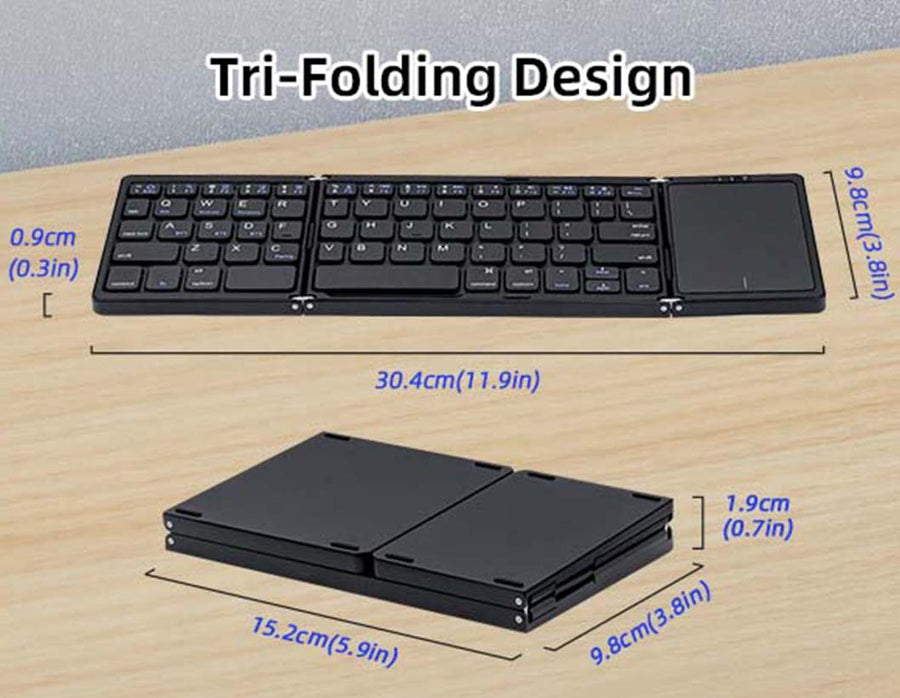 The Foldable Bluetooth Keyboard with Touchpad is a sleek, tri-fold wireless keyboard designed for portability and efficiency. Compatible with iOS, Android, and Windows devices, foldable keyboard features scissor keys for smooth typing and a high-precision multi-gesture touchpad. this foldable keyboard is compact design folds easily for pocket-sized convenience. With Bluetooth 5.0, it supports seamless multi-device connectivity and offers a rechargeable battery lasting up to 40 hours. The magnetic closure and LED indicators enhance usability, making this folding keyboard ideal for on-the-go productivity.