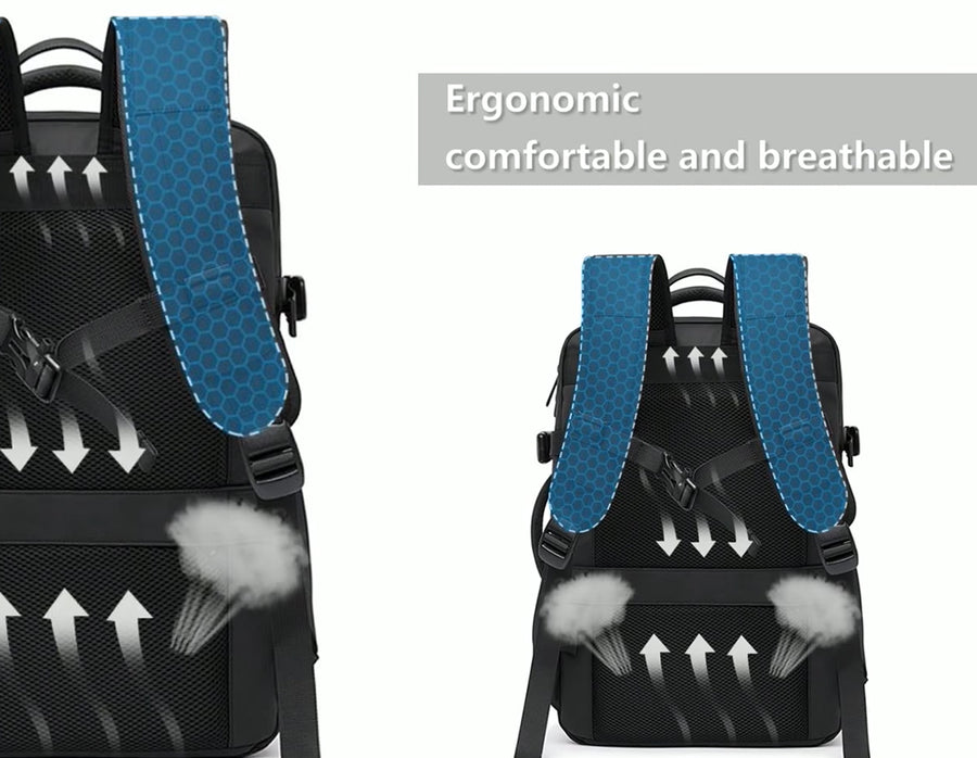 This multifunctional smart duffle bag, expandable from 22L to 35L, is designed for 17.3-inch laptops and equipped with an external USB charging port. Made from durable Oxford fabric, it features anti-theft pockets, quick access compartments, and breathable anti-sweat padding for comfort. With three versatile carrying options, a luggage strap for travel, and a stylish unisex design, the laptop bag combines practicality with a professional look, ideal for business or travel use.