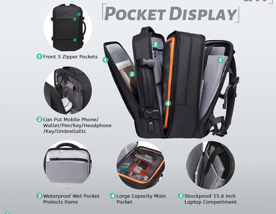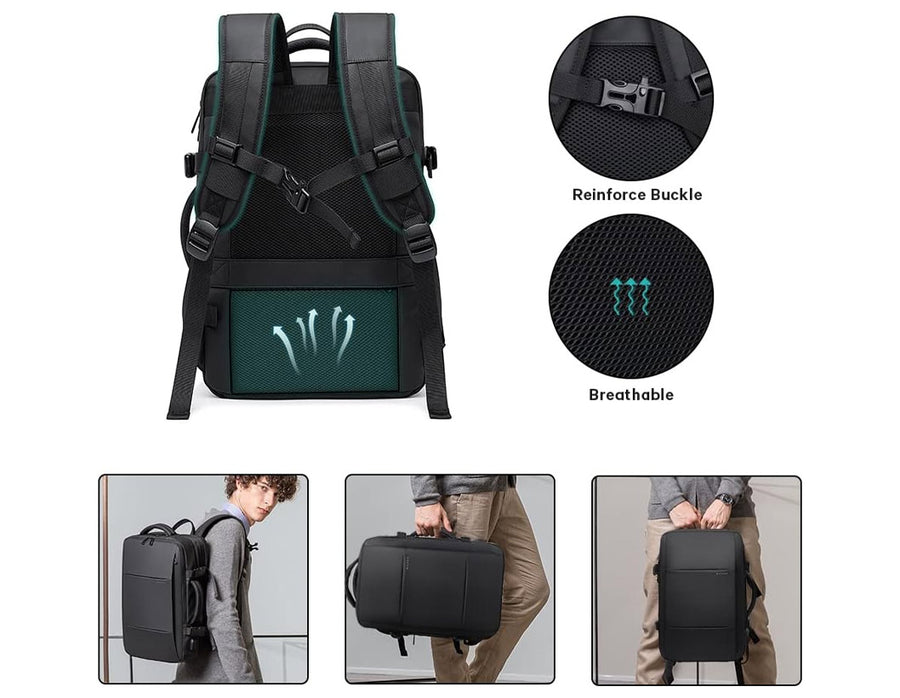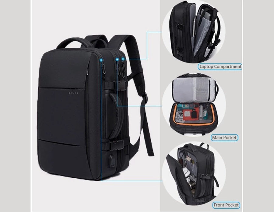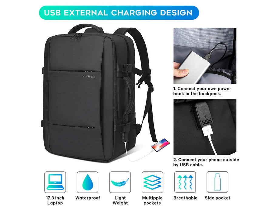 The BANGE 1908D Expandable Laptop Backpack is a versatile and durable laptop bag designed for modern travelers. The versatile 3-in-1 design transitions seamlessly between an office bag, travel companion, and hiking backpack, offering flexibility for every occasion. With a large 45L-55L capacity, this backpack for men fits a 15.6" laptop and up to a 17.3" laptop, making it perfect for office use or outdoor adventures. Its waterproof Oxford fabric protects your gear, while the anti-theft pocket ensures safety. The bag offers a 3-in-1 convertible design—use it as a laptop backpack for men, luggage, or a shoulder bag. Ideal for both men's bags and women's bags, this laptop bag is waterproof and includes an external USB charging port for on-the-go convenience.
