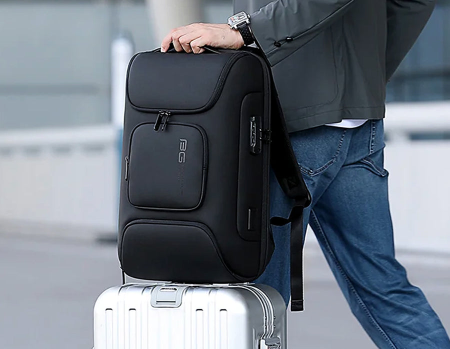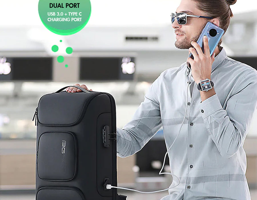 This laptop bag offers a password-protected anti-theft lock, backpack is waterproof and scratchproof fabric, and multiple compartments for organized storage. The travel bag supports Type-C & USB external charging, fits a 15.6" laptop, and features breathable anti-sweat padding for comfort. The shoulder backpack bag for men is designed with a luggage strap, side card and bottle pockets, and a comfortable handheld option, it's a perfect travel companion.