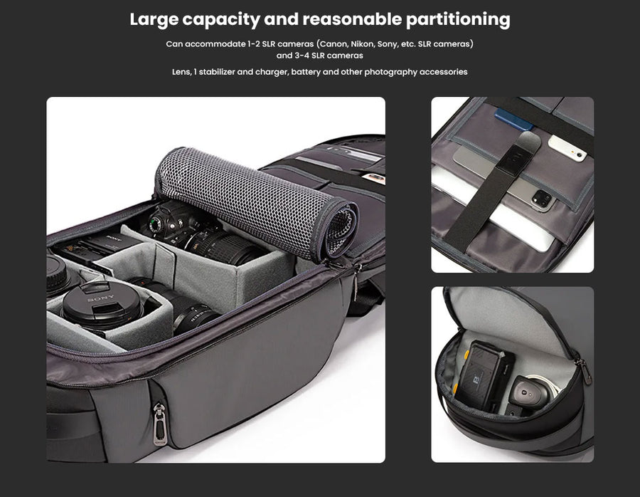 Introducing the ultimate travel camera bag, meticulously designed for photographers and adventurers alike. The camera backpack's spacious main compartment features soft padded sleeves that accommodate 1-2 SLR cameras, 3-4 lenses, a stabilizer, a charger, and other essential accessories. Customizable foam partitions and a separate section ensure your laptop, tablet, or iPad is protected. Professional camera bag with ample space for clothes, files, and documents, this bag for camera also includes dedicated pockets for your power bank, hard drive, and wallet. DSLR backpack with front pocket is perfect for a small notepad, while side pockets are ideal for a water bottle and umbrella. The camera bag with a laptop compartment and main zipper compartment offers secure closure, and a top pocket keeps your mobile phone handy. For enhanced comfort, it features a soft handle.