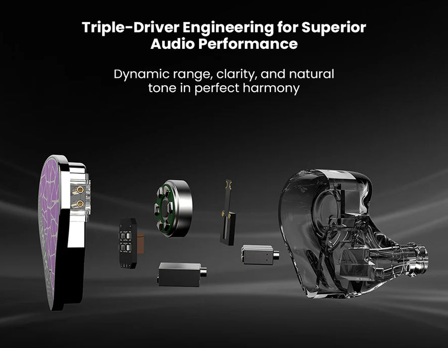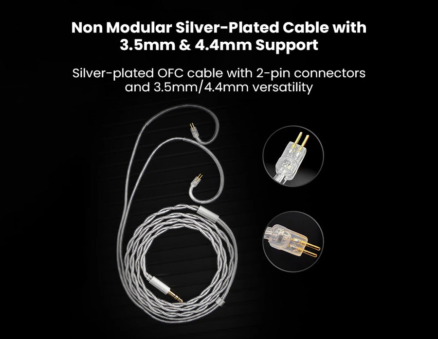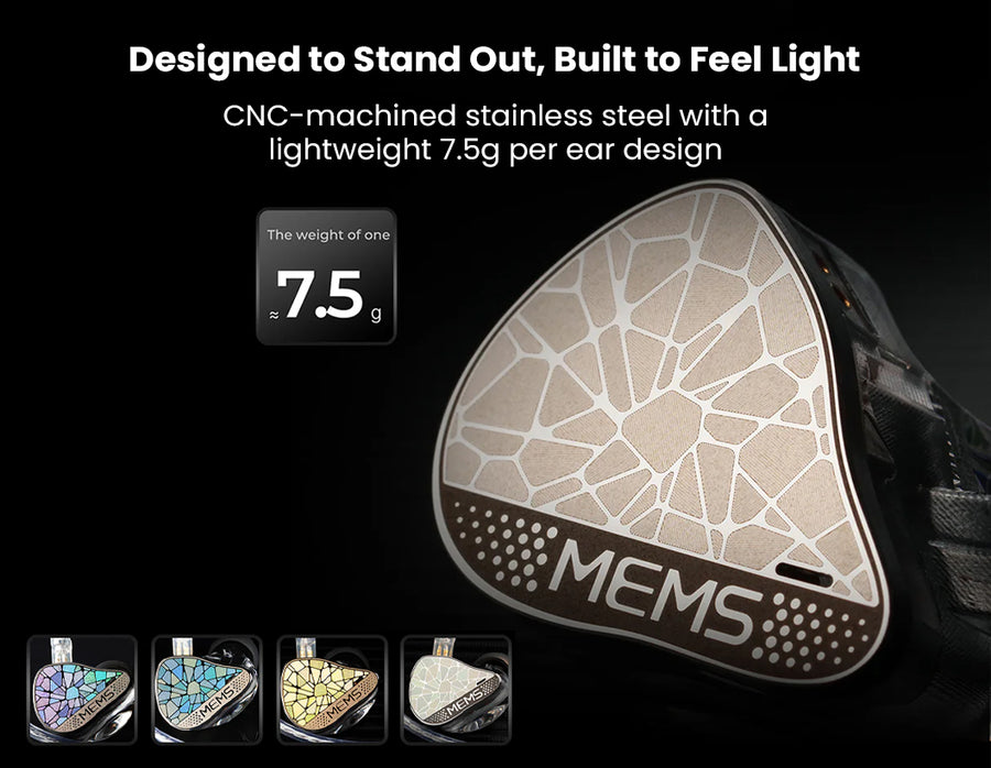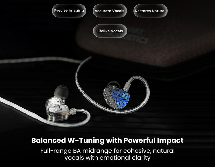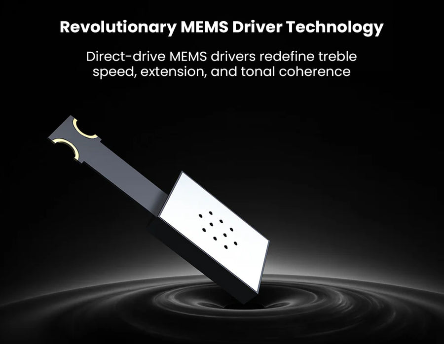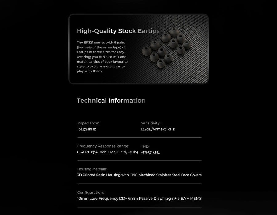 The Binary EP321 MEMS sets a new benchmark in tribrid IEMs with its innovative 2DD + 3BA + 1MEMS driver array. Dual Dynamic Drivers (10mm primary + 6mm passive radiator) produce deep and textured sub-bass rumble. Three Balanced Armatures deliver transparent mids and natural vocals, and the world's first direct-drive MEMS driver achieves electrostatic-like treble extension to 40kHz with under 1% THD for shimmering airiness and micro-detail. This IEM reproduces a well-balanced and detailed presentation overall. It offers a W-shaped tuning with quality bass, forward mids and sparkling highs. The 1.2m 8-strand silver-plated copper modular cable ensures low microphonics and pure signal transfer, while 3D-printed resin shells with CNC stainless steel faceplates provide top-notch passive isolation. The shells feel lightweight and provide ergonomic fit for all day comfort. Strategic venting increases comfort by decreasing pressure buildup during workouts or casual home sessions.Β