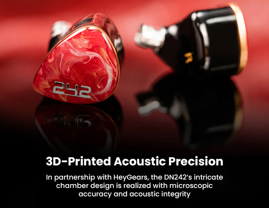 In collaboration with 3D printing leader HeyGears, DUNU has crafted the DN242’s complex acoustic chambers and ergonomic ear shells using high-precision 3D printing. The result is a comfortable fit for this in-ear monitor, with minimal air pressure buildup, allowing long listening sessions without discomfort.