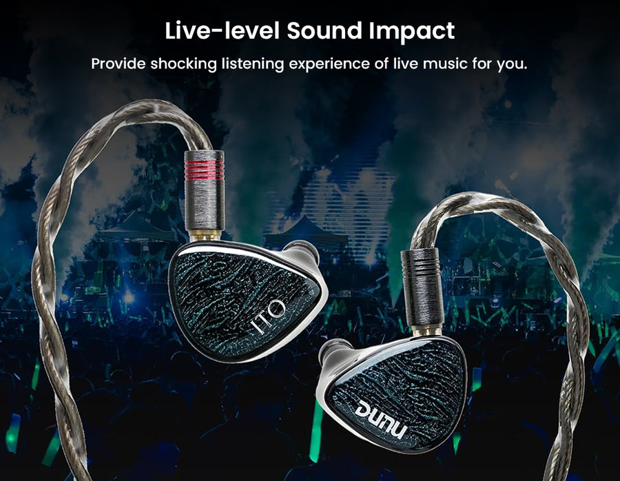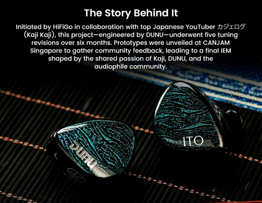 The DUNU x KOTO ITO is the result of a creative collaboration between DUNU and Japanese HiFi influencer Kaji Kaji (Koto). It integrates 2 Dynamic Drivers and 2 Balanced Armatures per side, delivering a seamless blend of warmth, clarity and spatial precision. The 10mm Bio-Cellulose driver provides deep & defined bass, while the 8mm LCP composite driver adds taut mid-bass and clarity. Two custom-tuned balanced armatures enrich the treble and ultra-high frequencies, ensuring articulate detail and smooth extension. Crafted from lightweight, skin-friendly resin, each earpiece weighs just 6.5 g for a natural, fatigue-free fit. The sound signature is full-bodied and musical, tuned for rhythm-driven genres like rock, hip-hop, and electronic, while maintaining balance and airiness for instrumental and vocal tracks. Bundled with a high-purity 4-core silver-plated single-crystal copper cable, the ITO supports interchangeable terminations via the Q-Lock Quick-Switch system, offering both 3.5mm single-ended and 4.4mm balanced outputs.