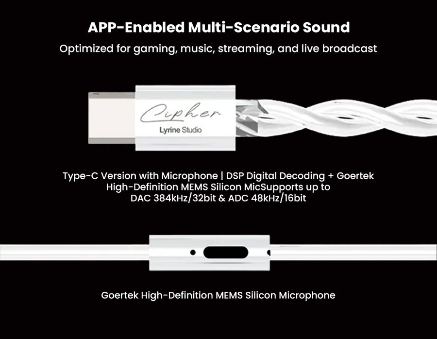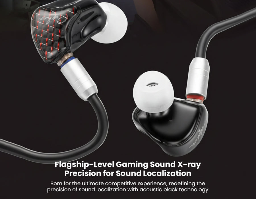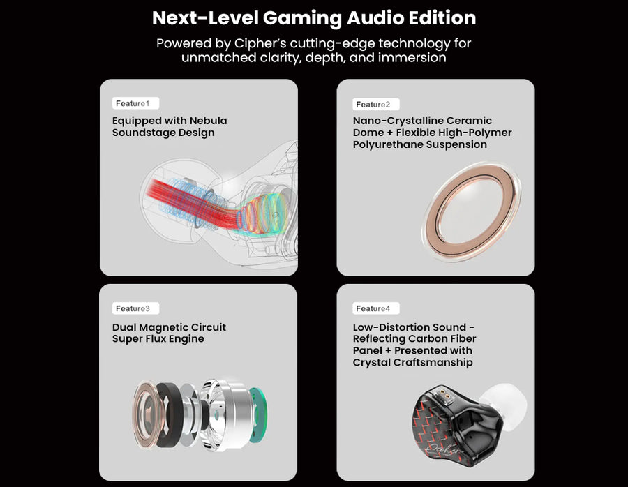 Cipher Gaming is a flagship esports-focused wired in-ear monitor designed for extreme sound localization and competitive precision, powered by an advanced nano-crystalline ceramic dynamic driver. Its high-rigidity diaphragm minimizes breakup distortion and delivers ultra-fast transients, accurately reproducing footsteps, gunfire, and environmental cues. A dual-magnetic-circuit super flux engine (>1.2T) ensures tight, controlled bass and clean separation even at ultra-low frequencies, while the Nebula Soundstage dual-cavity acoustic design creates a spherical sound field with ±3° positional accuracy and enhanced vertical awareness. Finished in a carbon fiber dark edition low-resonance shell for comfort during long sessions, Cipher includes a silver-plated detachable 0.78mm 2-pin cable with USB Type-C (mic, app EQ, sound effects) or 3.5mm options—making it a powerful, customizable choice for competitive gaming and immersive listening.