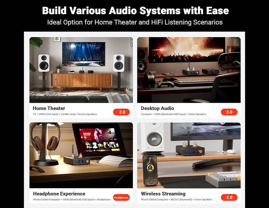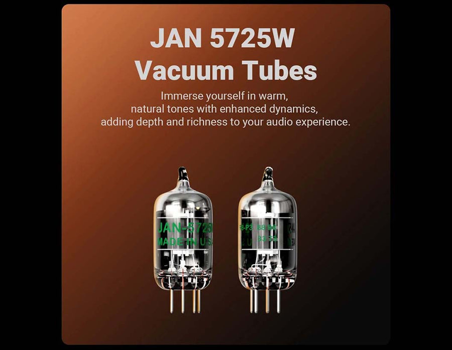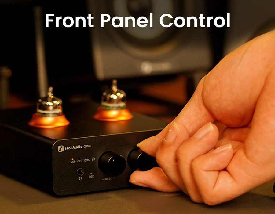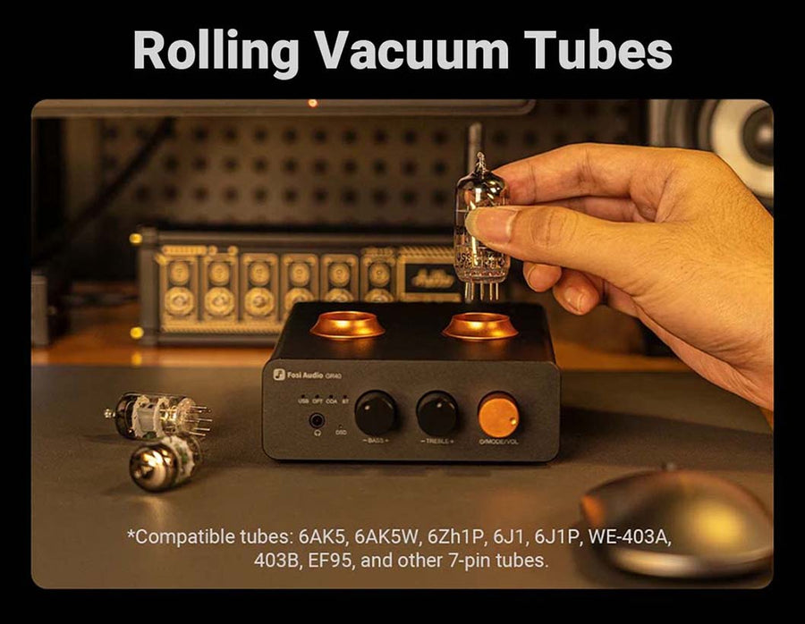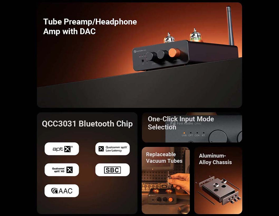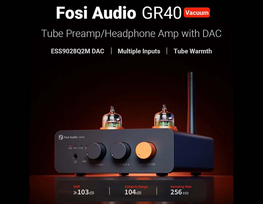 The Fosi Audio GR40 is a compact DAC and preamplifier featuring the ES9028Q2M DAC chipset and Qualcomm QCC3031 Bluetooth 5.1 module. It supports high-resolution audio playback up to PCM 32bit/384kHz and native DSD256. The device includes dual GE 5654W vacuum tubes in the preamp stage, offering both digital and analog input options. Outputs include RCA line out and a 3.5mm headphone jack. The frame is constructed from CNC-machined aluminum alloy for durability and stability.