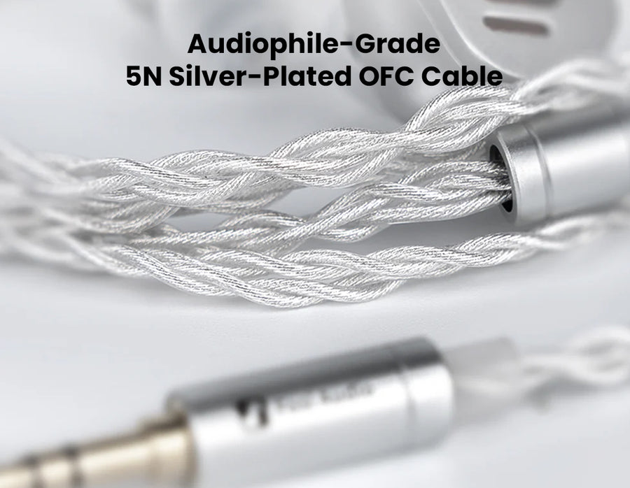 A detachable high-end 4-core 392-strand 5N OFC silver-plated copper cable (0.78mm 2-pin) minimizes signal loss for pure fidelity. Customize your sound signature with swappable aluminum/brass nozzles and included eartips (3x balanced, 3x vocal) for bass-boost, vocal-forward, or analytical profiles.