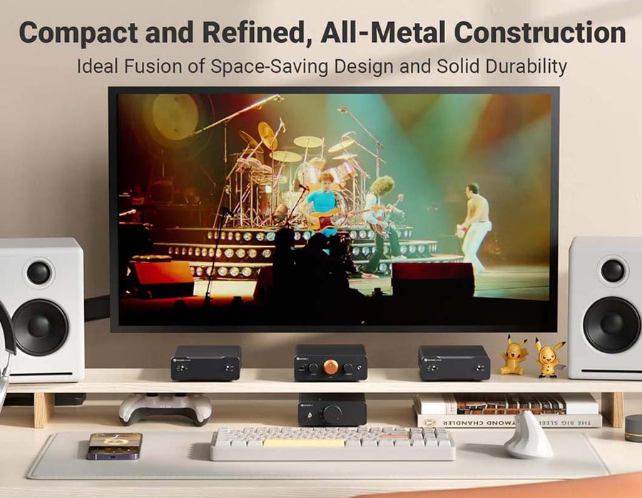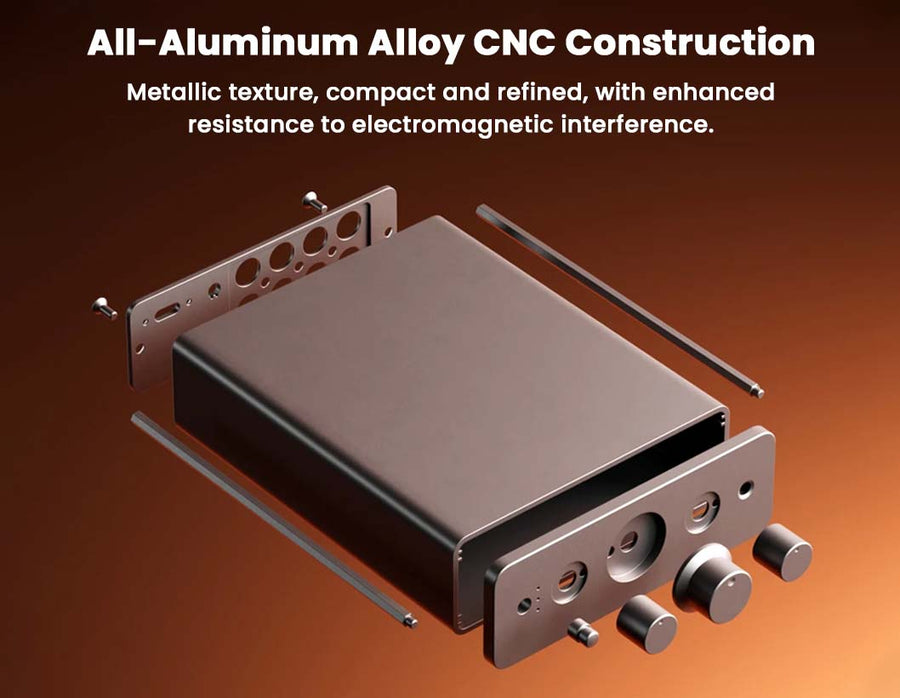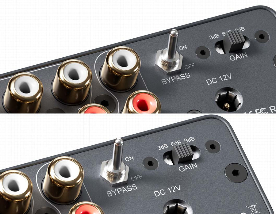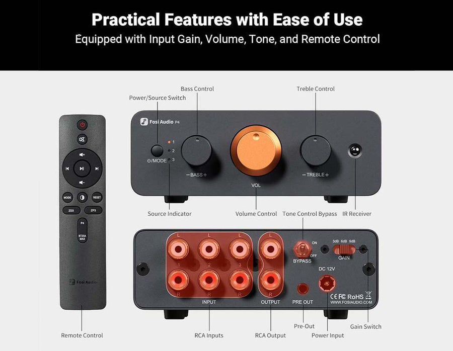 This premium stereo preamplifier offers versatile multi-source connectivity with three RCA inputs, allowing seamless switching between CD players, DACs, streamers, and more without cable swapping. Designed for audiophile-grade performance, it features ultra-low distortion (THD+N ≤ 0.003%), high SNR (≥110dB), and exceptional crosstalk rejection for clean, detailed sound. Custom audio tuning is made easy with ±12dB bass/treble tone controls, a bypass switch for pure signal path, and three gain settings to match any amplifier. A remote-controlled motorized volume knob adds convenience, while dual RCA outputs enable flexible system integration with powered speakers, subs, or external amps. Housed in a rugged CNC-machined aluminum body with an included 12V power supply, it combines durability with sleek aesthetics. Compact and stylish, it fits effortlessly into modern home setups, offering the perfect balance of functionality, sound quality, and user-friendly design.