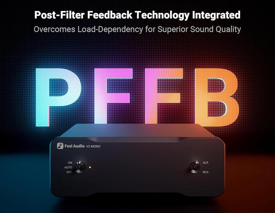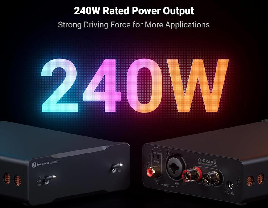 Introducing the Fosi Audio V3 Mono Mini Power Amplifier—a debut Class D amplifier engineered with cutting-edge PFFB technology to elevate sound purity and optimize system efficiency. Building on the success of the V3 stereo amplifier, the V3 Mono is meticulously crafted to deliver an unmatched audio experience for discerning listeners. With versatile input options including RCA, XLR, and ¼" TRS, the V3 Mono offers flexibility and high-fidelity sound quality with impressive SINAD levels of 101dB (RCA) and 93dB (XLR), and an exceptional SNR of ≥123dB. Boasting powerful output capabilities of 240W @ 4Ω (mono) or 100W @ 4Ω (stereo), it’s the ideal amplifier for audiophiles seeking top-tier performance. The V3 Mono also features Automatic Signal Sensing, which places the amplifier in standby mode after 10 minutes of no signal input, reducing power consumption and enhancing energy efficiency. Designed with a minimalist aesthetic, it seamlessly integrates into any environment—from home theaters and study rooms to desktop setups and studios—bringing exceptional sound to every space.