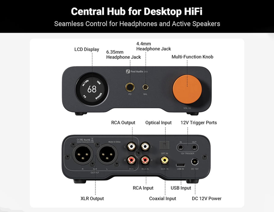 The Fosi Audio ZH3 is a complete Hi-Fi solution that unifies a DAC, headphone amplifier, and preamp into one precision-engineered device, delivering studio-grade clarity for any desktop setup. Powered by the AKM 4493SEQ DAC, XMOS XU316 USB processor, and four TI OPA1612 op-amps, it offers rich detail, ultra-low noise, and lifelike accuracy. With support for PCM 32-bit/768 kHz, DSD512, and 24-bit/192 kHz optical/coaxial inputs, the ZH3 ensures true lossless playback across modern and legacy sources. Its powerful output—up to 2570 mW × 2 balanced with three-stage gain control—makes it suitable for everything from sensitive IEMs to demanding planar magnetic headphones.