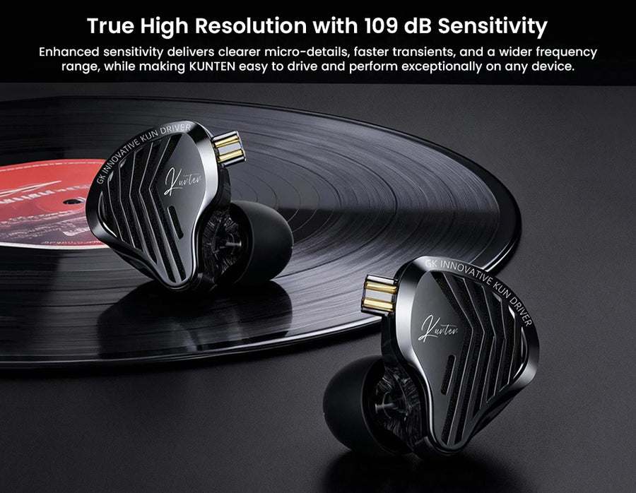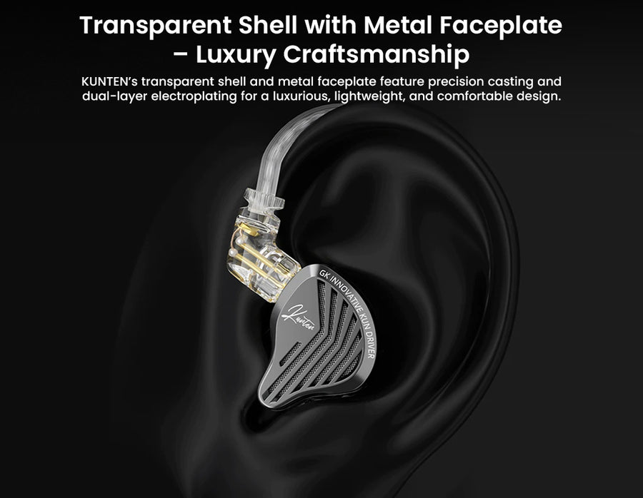 GK KUNTEN IEM Black is a wired dynamic in-ear monitor crafted to elevate everyday listening, driven by a precision-tuned 10mm super-linear dynamic driver for textured sub-bass rumble, natural full-bodied mids, and airy treble detail up to 40kHz. Its polymer-reinforced resin diaphragm and advanced acoustic tuning deliver ultra-fast transients with minimal distortion and clean decay, while the versatile single-driver signature punches through EDM, hip-hop, and rock yet provides clear spatial cues for calls, voice chats, and immersive gameplay. Housed in ergonomic black resin shells with a striking metal faceplate and pre-formed ear hooks for all-day comfort and 26dB noise isolation, it feels premium and secure, with the high-purity dual-parallel silver-plated detachable 0.78mm 2-pin cable—complete with gold-plated termination plug.