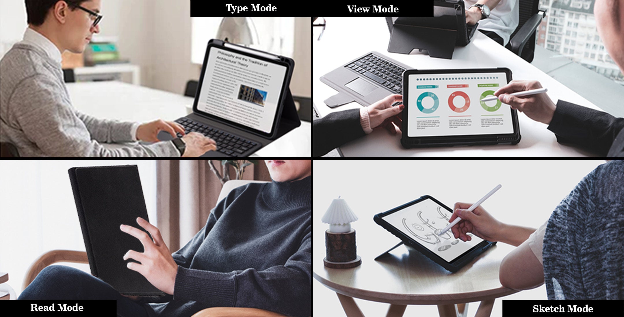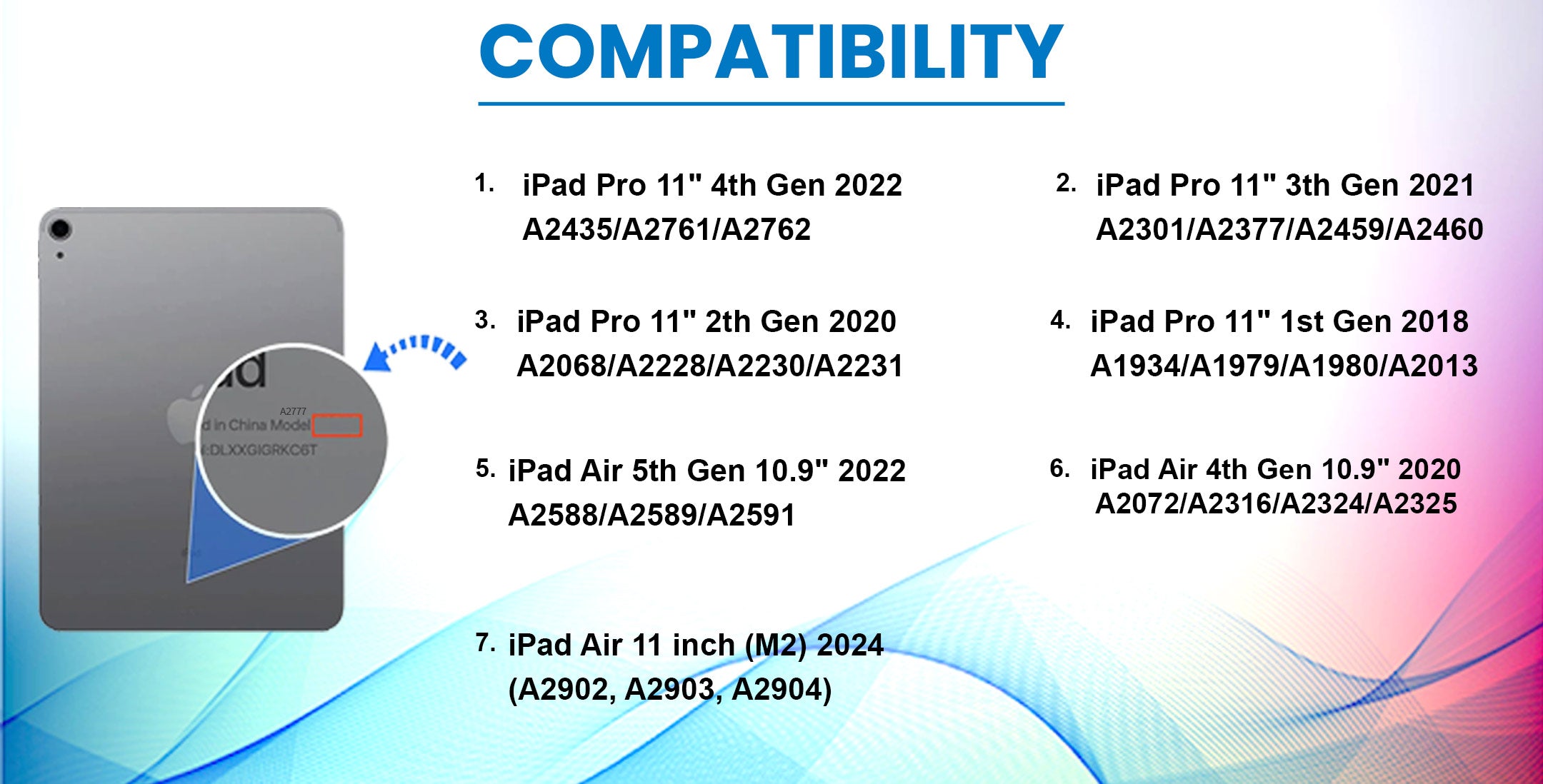 This 3-in-1 keyboard case and transparent cover are specifically tailored for the iPad Air 11 M3 2025 (A3268, A3269, A3271), M2 2024 (A2902, A2903, A2904), iPad Pro 11” (2022 4th Gen) (3rd Gen 2021) (2020 2nd Gen) (2018 1st Gen), iPad Air 10.9” (5th Gen, 2022) (4th Gen, 2020). Easily transform your iPad into a laptop by magnetically attaching it to the back cover, connecting the wireless keyboard, and placing your stylus Pencil on top. Enjoy multiple viewing angles with its 360-degree rotating design and adjustable stand options. The built-in multi-gesture trackpad allows for seamless navigation, while the sturdy construction provides ultimate protection against shocks and drops. Portable and convenient, it's perfect for work, study, or entertainment on the go.